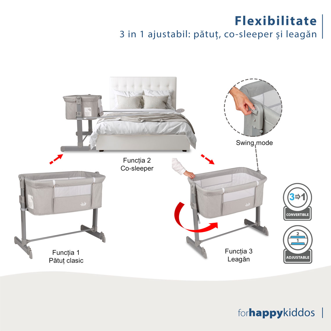 3-in-1, pentru flexibilitate maximă: Îl poți folosi ca pătuț clasic, ca pătuț co-sleeper atașat de patul părinților sau ca leagăn. E multifuncțional și gata să-ți facă viața mai ușoară, indiferent de momentul zilei.