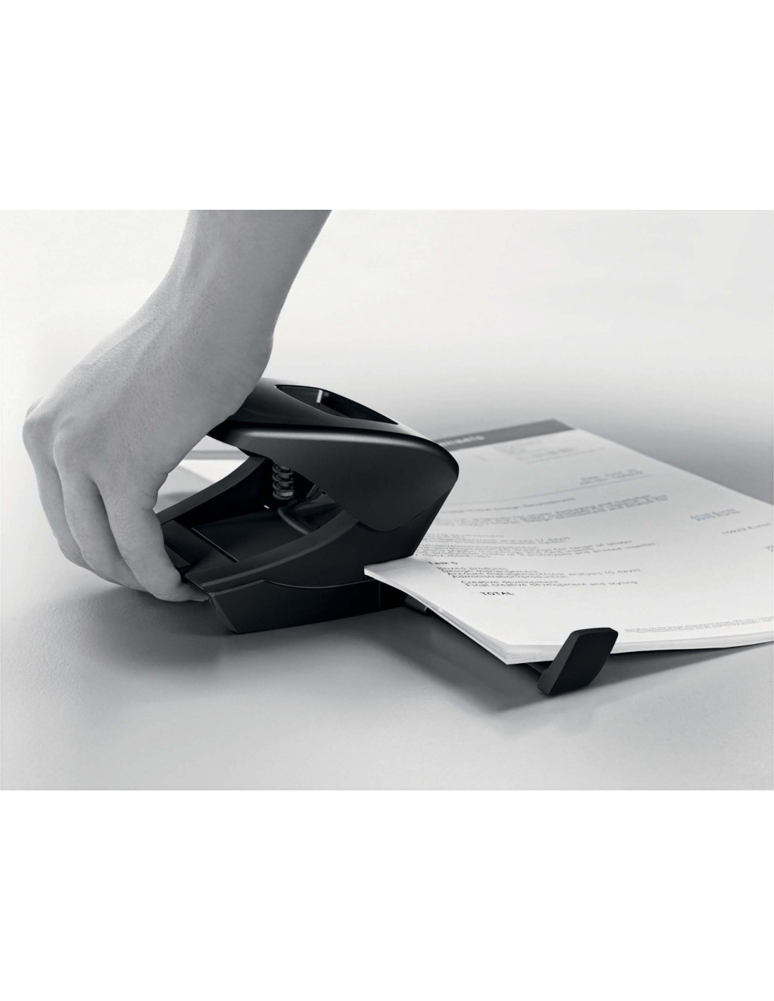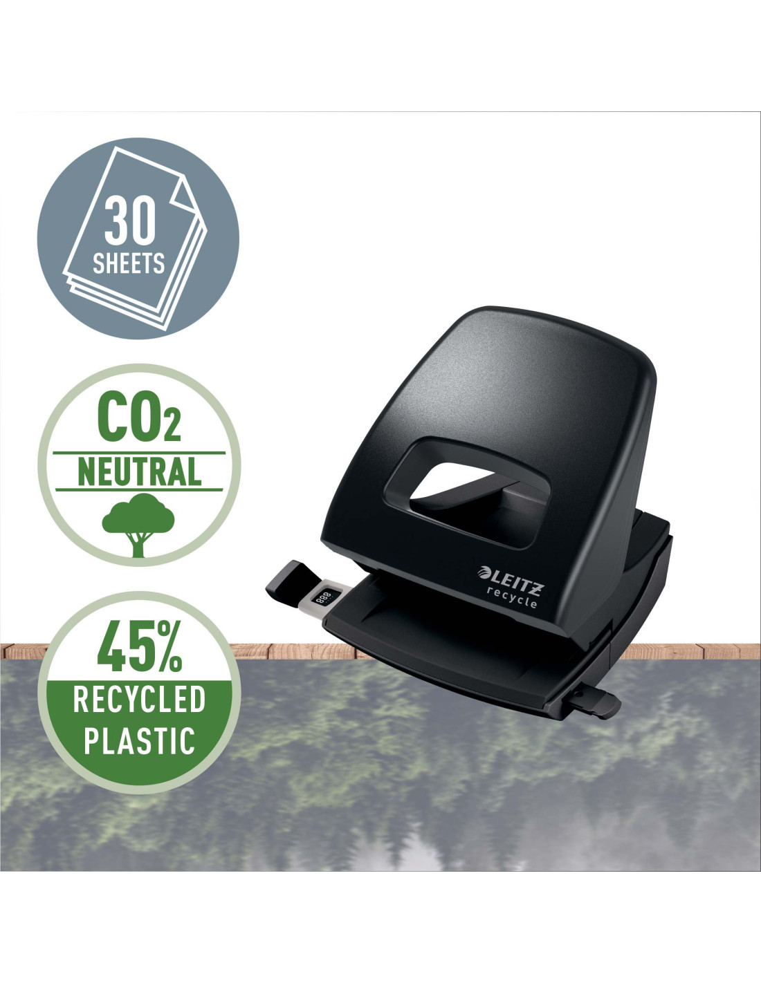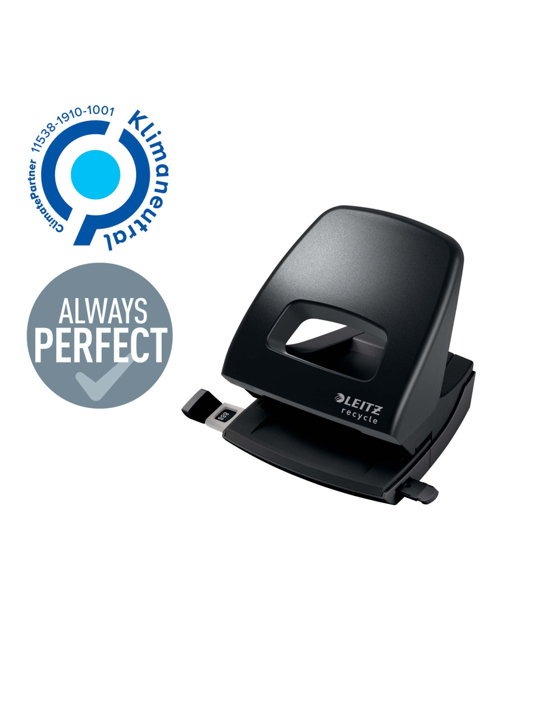 Perforeaza pana la 30 coli(80 gsm). Fabricat din plastic reciclat in proportie de 45% (post-consum), cu impact neutru asupra mediului. Reciclabil 100%, putand fi demontat si valorificat complet. Datorita manerului ergonomic, efortul de perforare este redus. Distantier gradat cu fereastra de indicare a pozitiei si fixare sigura. Tavita pentru confeti cu eliberare usoara. 10 ani garantie si siguranta certificata GS. Ambalaj prietenos cu mediul: cutie din carton 67% reciclat si complet reciclabil.