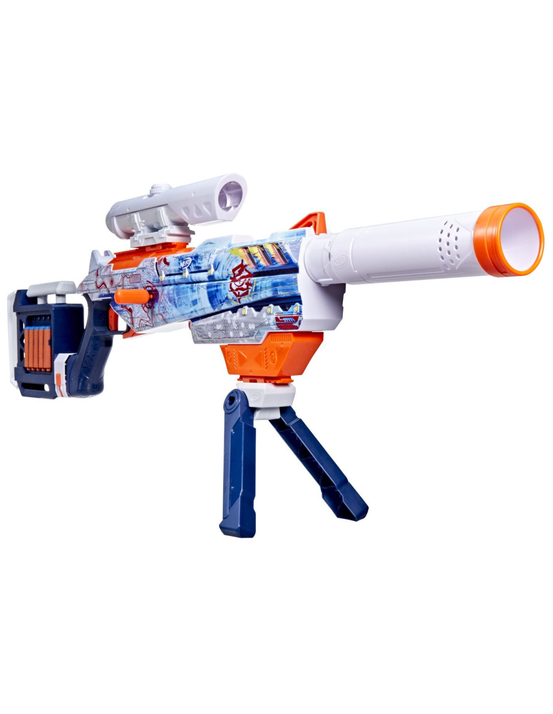 Pistolul Nerf Loadout Arctic Zerostriker cu actiune manuala are un incarcator intern pentru 6 sageti si vine cu atasamente pentru luna, pat, teava si bipod.