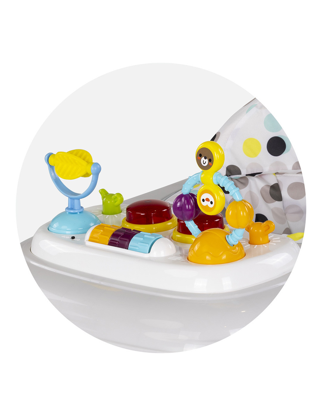 - Panou de joaca distractiv cu jucarii colorate, butonane si lumine - stimuleaza abilitatile motorii fine si dezvoltarea senzoriala