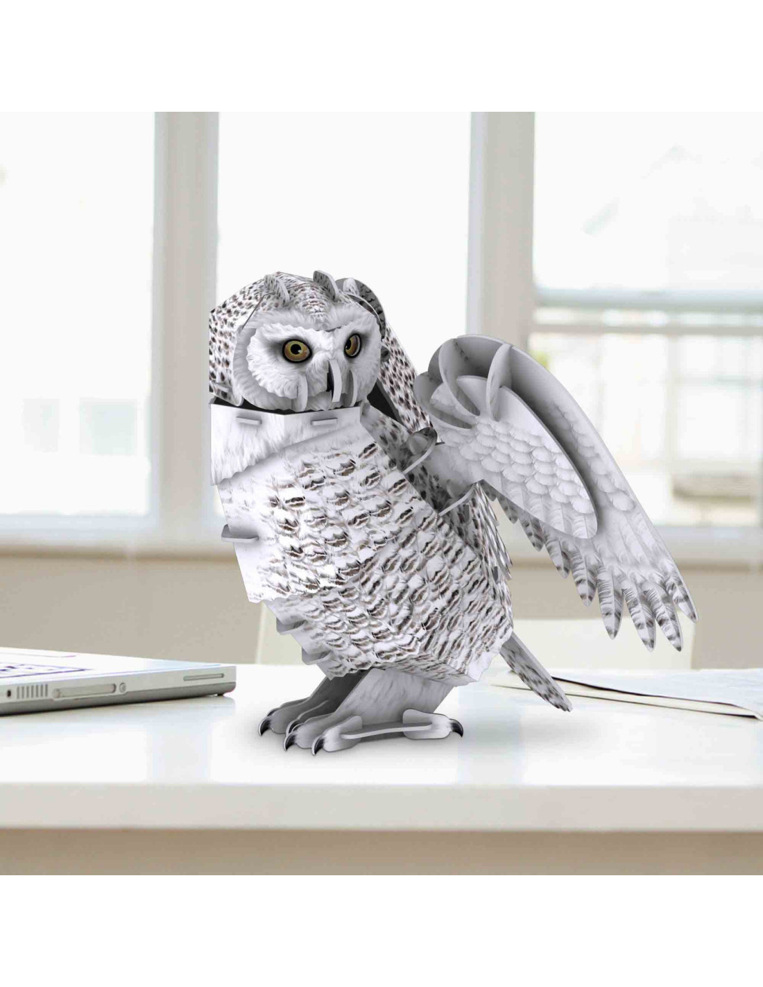 Caracteristici autentice: Avand pene de culoare alba si gri, bufnita evidentiaza o actiune de rotatie a capului si o actiune de deschidere a aripilor.