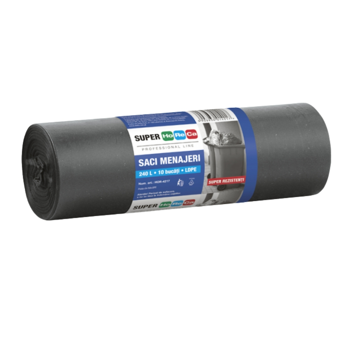 Sacii menaj HORECA Super Rezistenți 240L sunt creați pentru performanță și siguranță în utilizare. Robuști, fiabili și igienici, aceștia oferă soluția ideală pentru gestionarea eficientă a deșeurilor de mari dimensiuni, în orice mediu profesional.