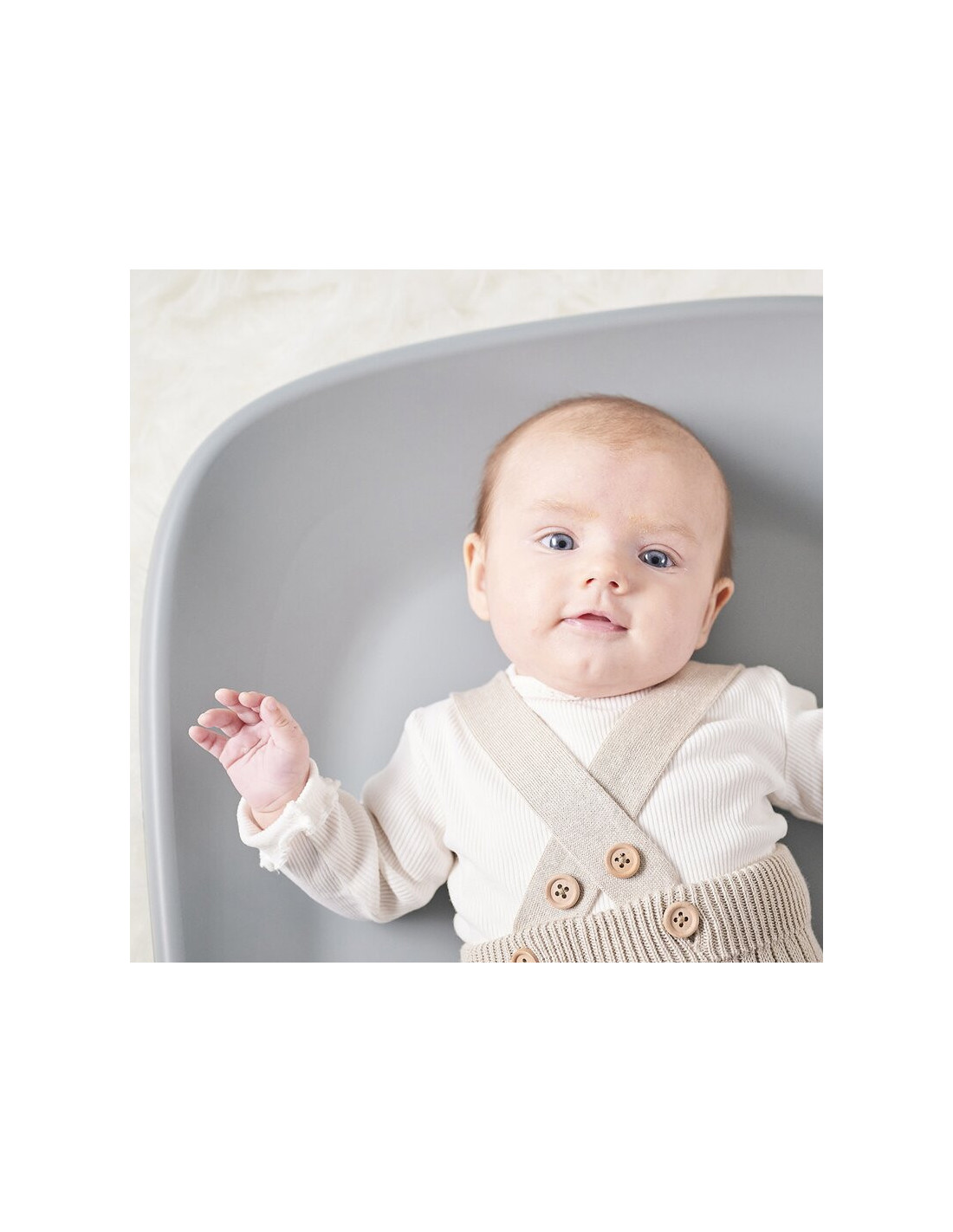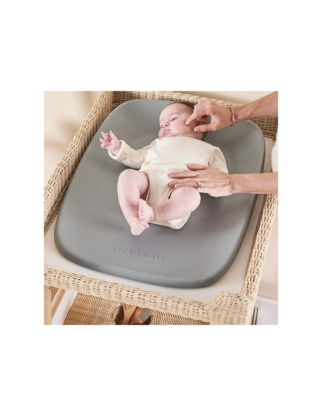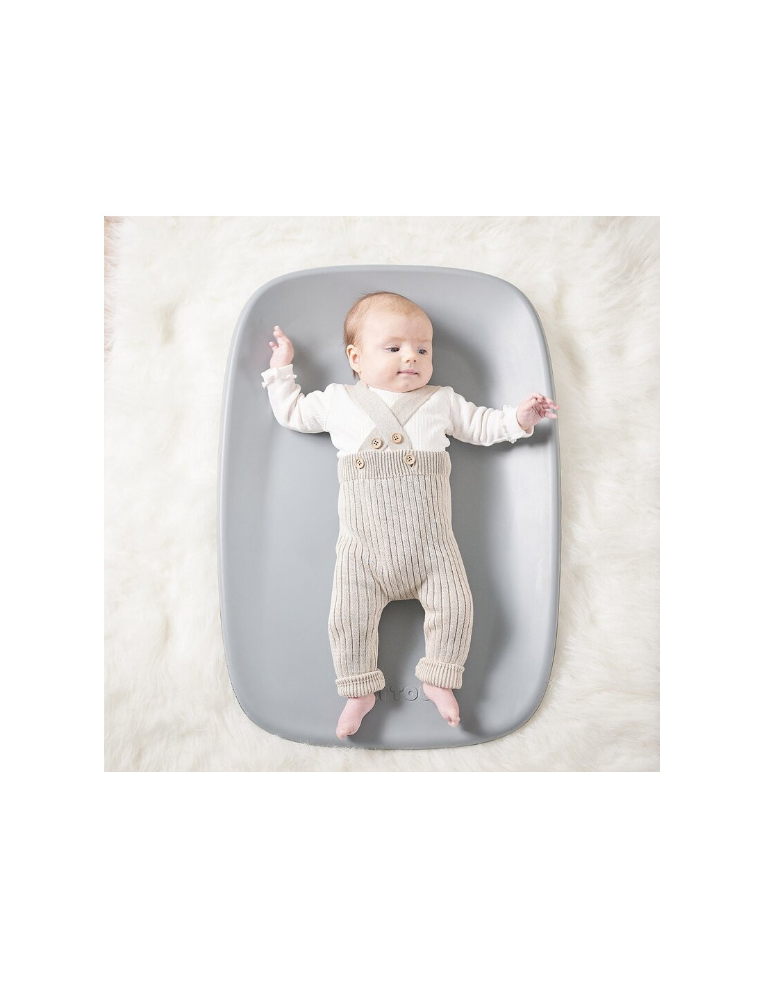 Partea inferioara este texturata tip „fagure de miere”, oferind un efect de vid. Greutatea copilului creeaza o prindere naturala pe masa de infasat, prevenind alunecarea si permitand mutarea usoara dupa utilizare.