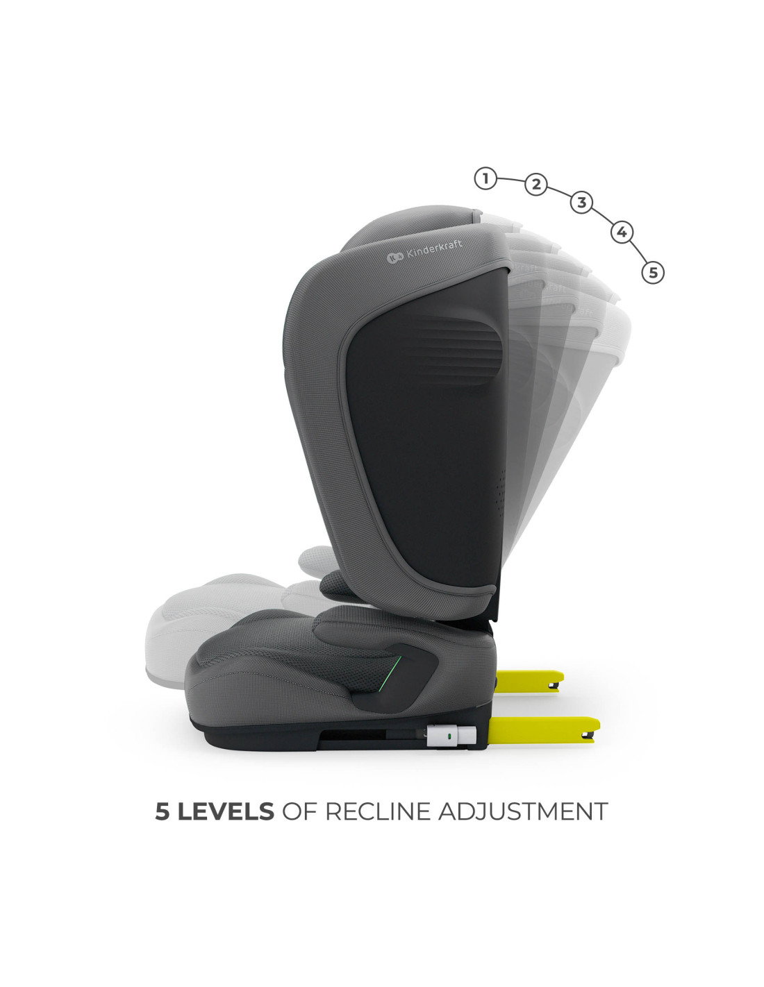 Kinderkraft UNITY 2 i-Size GREY dispune de un spatar reglabil in 5 pozitii, ceea ce permite ajustarea pozitiei copilului in functie de nevoile sale pentru somn, relaxare sau calatorii active.
