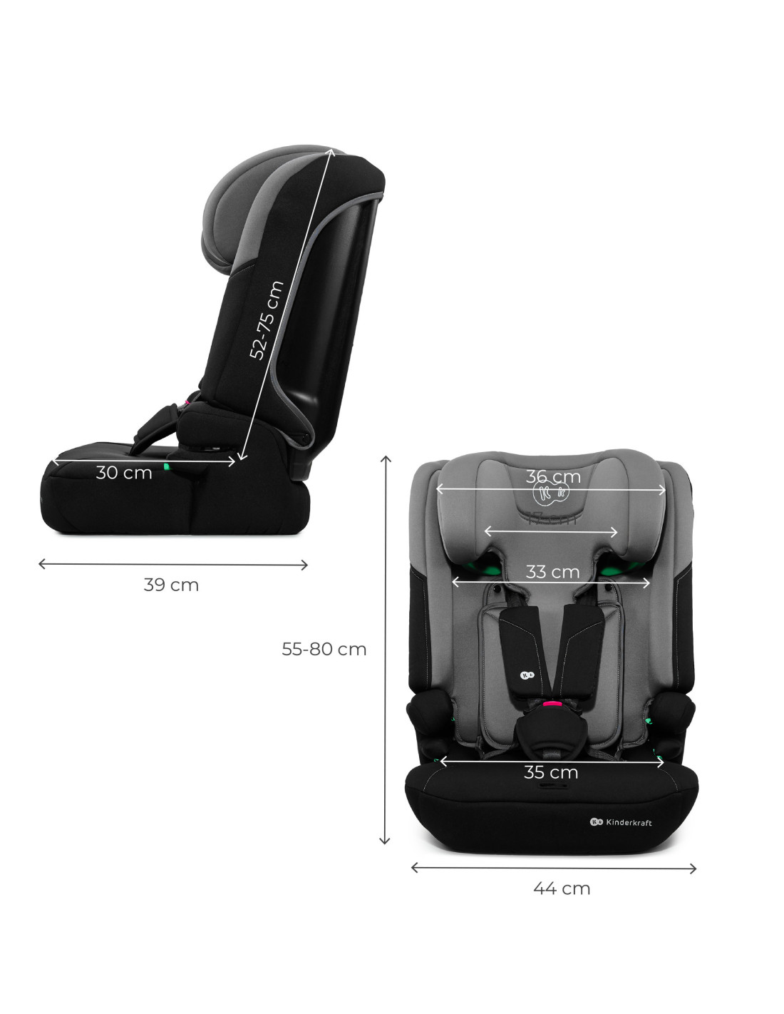Caracteristici principale ale produsului Kinderkraft I-COMFY DARK GREY este conform standardului ECE R129 i-Size Sistem EASY GROW reglare simultana a tetierei si a centurilor Sistem H-GUARD tetiera cu 3 straturi de protectie si spuma SPS protectie laterala intarita Ghidaj unic pentru centura pelviana pozitionare stabila si corecta 10 trepte de reglare a spatarului sezut larg si confortabil, centuri in 5 puncte cu pernute moi si strat antiderapant Poate fi folosit ca inaltator pentru copii intre 140150 cm Specificatii tehnice Lungimea interioara a sezutului 30 cm Lungimea exterioara a sezutului 39 cm Latimea sezutului (exterioara) 44 cm Latimea sezutului (interioara) 35 cm Latimea totala exterioara 50 cm Înaltimea interioara minima 52 cm Înaltimea interioara maxima 75 cm Înaltimea exterioara minima 55 cm Înaltimea exterioara maxima 80 cm Latimea spatarului (interioara) 33 cm Latimea spatarului (exterioara) 44 cm Latimea tetierei (exterioara) 17 cm Latimea tetierei (interioara) 36 cm