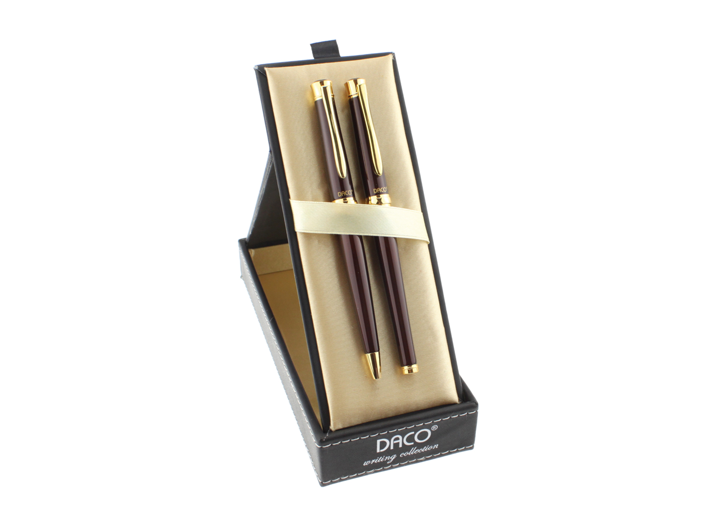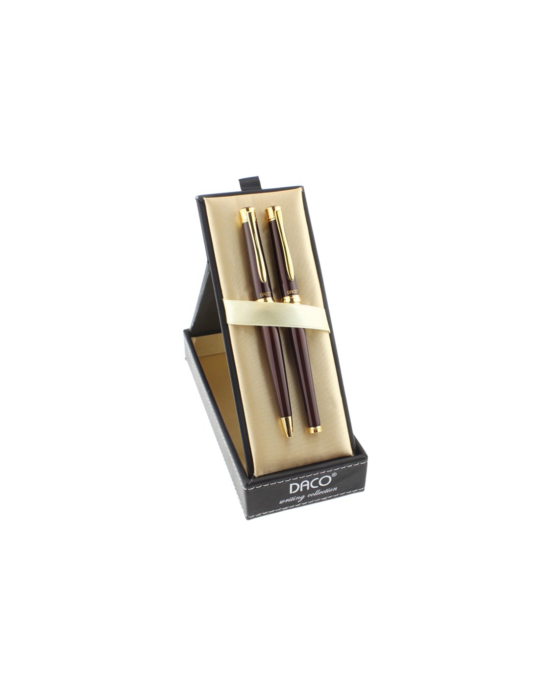 Setul DACO SE217 combină două instrumente de scris de calitate – un pix și un stilou – într-un design metalic visiniu completat de accente aurii, oferind un aspect modern și profesionist. Este un set potrivit atât pentru utilizarea zilnică, cât și pentru ocazii speciale.