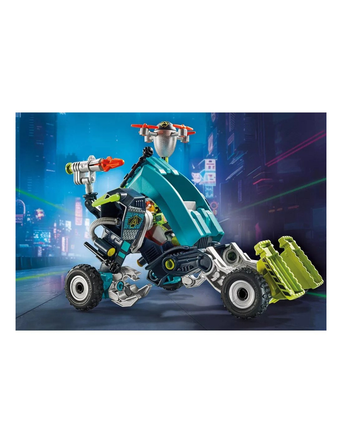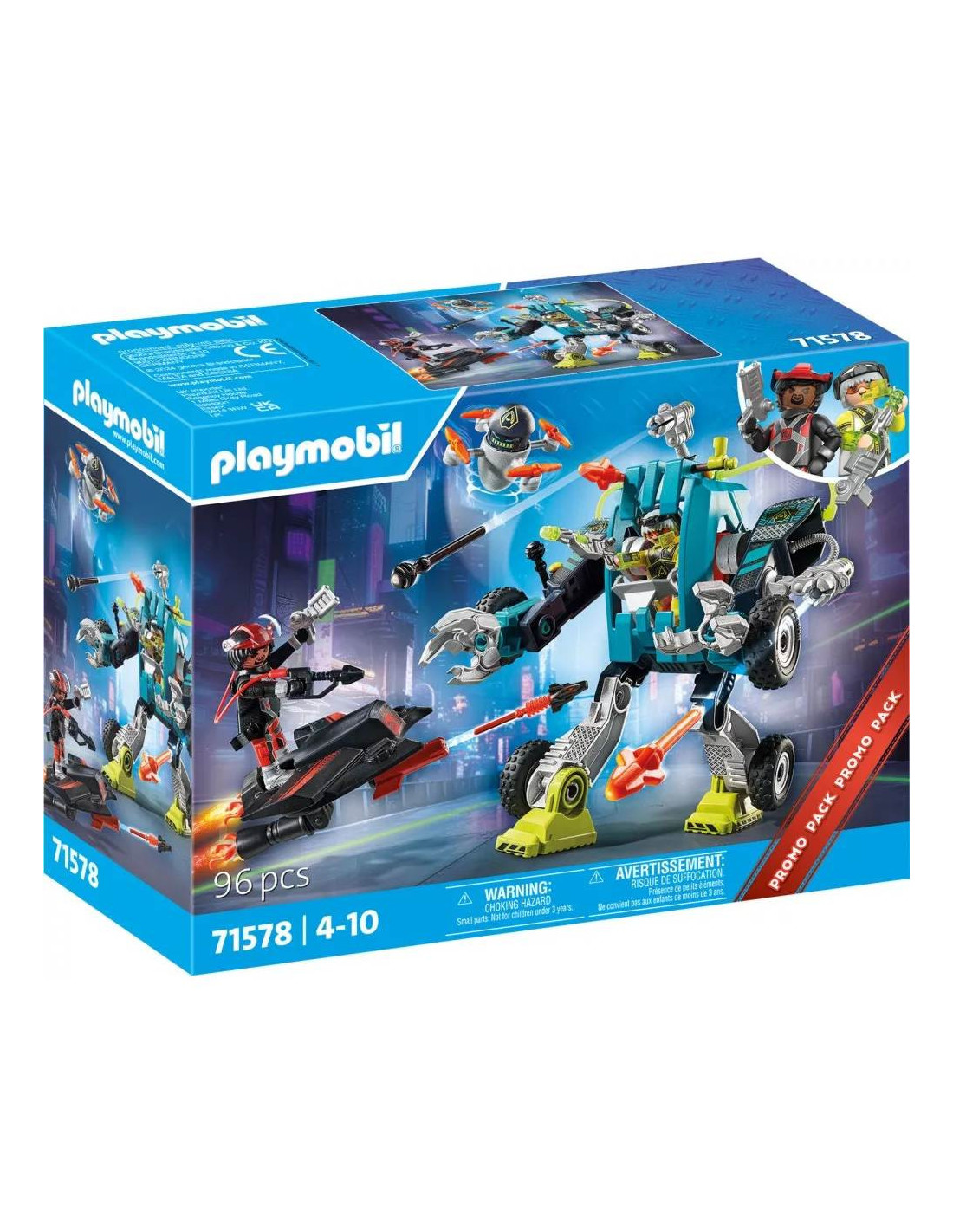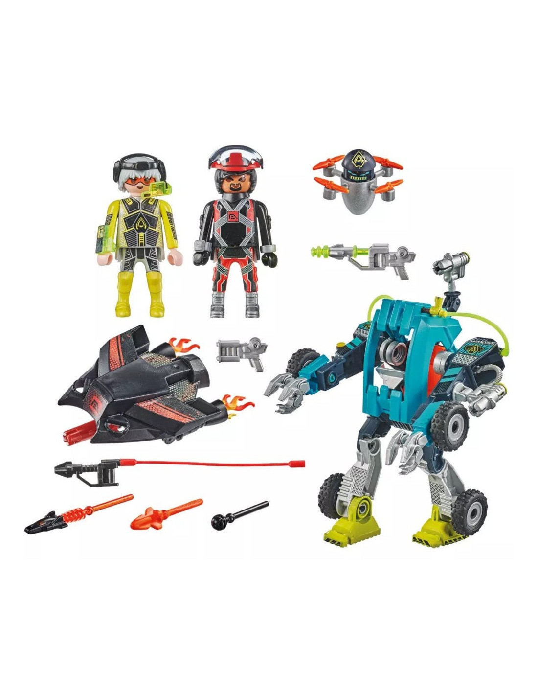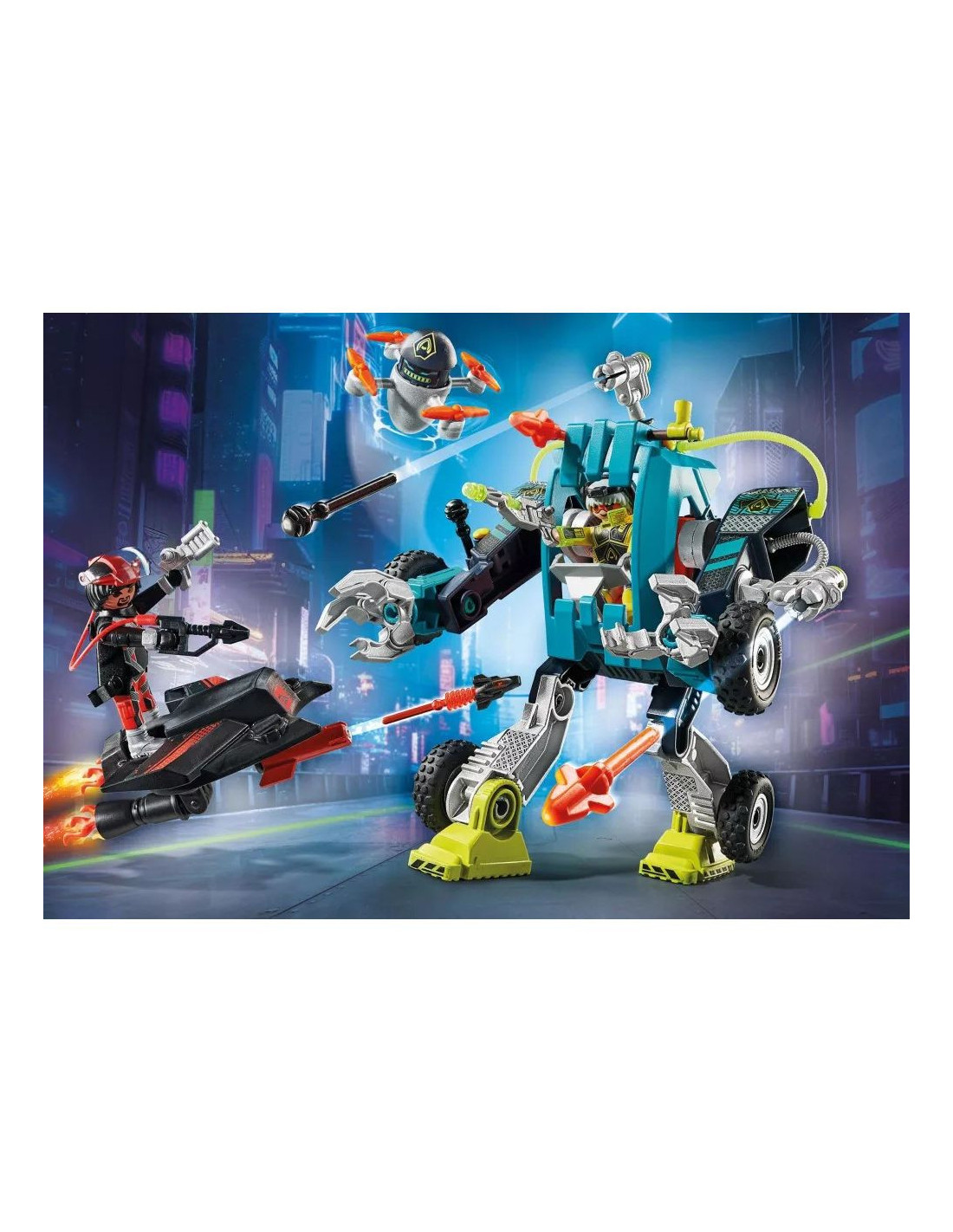 Cu acest set PLAYMOBIL incepe lupta masinilor in camera copiilor! Sari pe planorul zburator cu doua motoare si un tun rotativ si arunca-te in actiune. Dar si robotul de lupta este extrem de flexibil si echipat cu doua tunuri si o drona. Pentru a plasa o figurina in robot, cabina poate fi deschisa spre inainte. Robotul de lupta super flexibil poate fi transformat în plus intr-un vehicul in doua pozitii.