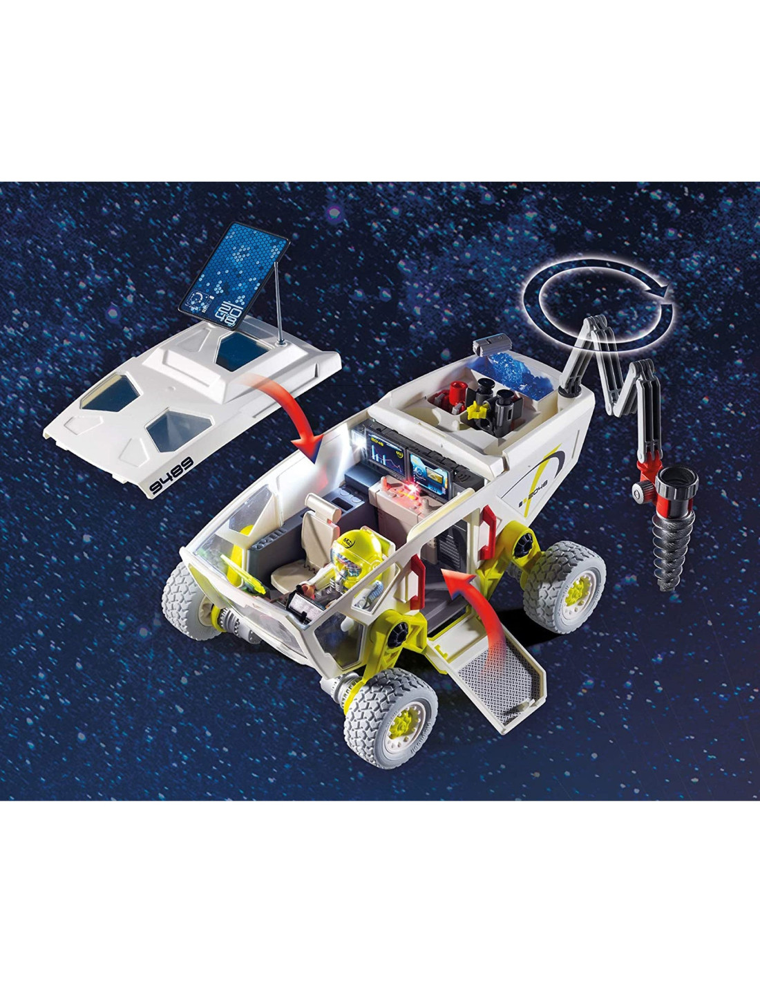 Astronautii de la PLAYMOBIL au un vehicul special pentru cercetarea planetei Marte si sunt pe cale sa afle mai multe despre aceasta planeta. Astronautul opreste vehiculul de cercetare, deschide trapa, iese si aduna o piatra albastra. Inainte de a se intoarce in statia spatiala, el colecteaza mai multe pietre pentru cercetare. Vehiculul are un acoperis detasabil, un brat mobil cu diferite dispozitive ce se pot schimba si multe alte accesorii (Sunt necesare 2 baterii 1.5 V )
