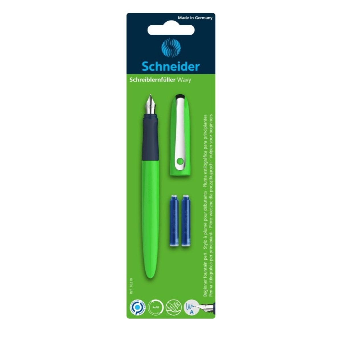 Stiloul Schneider Wavy Verde combină designul ergonomic cu tehnologia germană de precizie, oferind o scriere fluidă, confortabilă și ecologică — un partener de încredere pentru fiecare zi de școală.