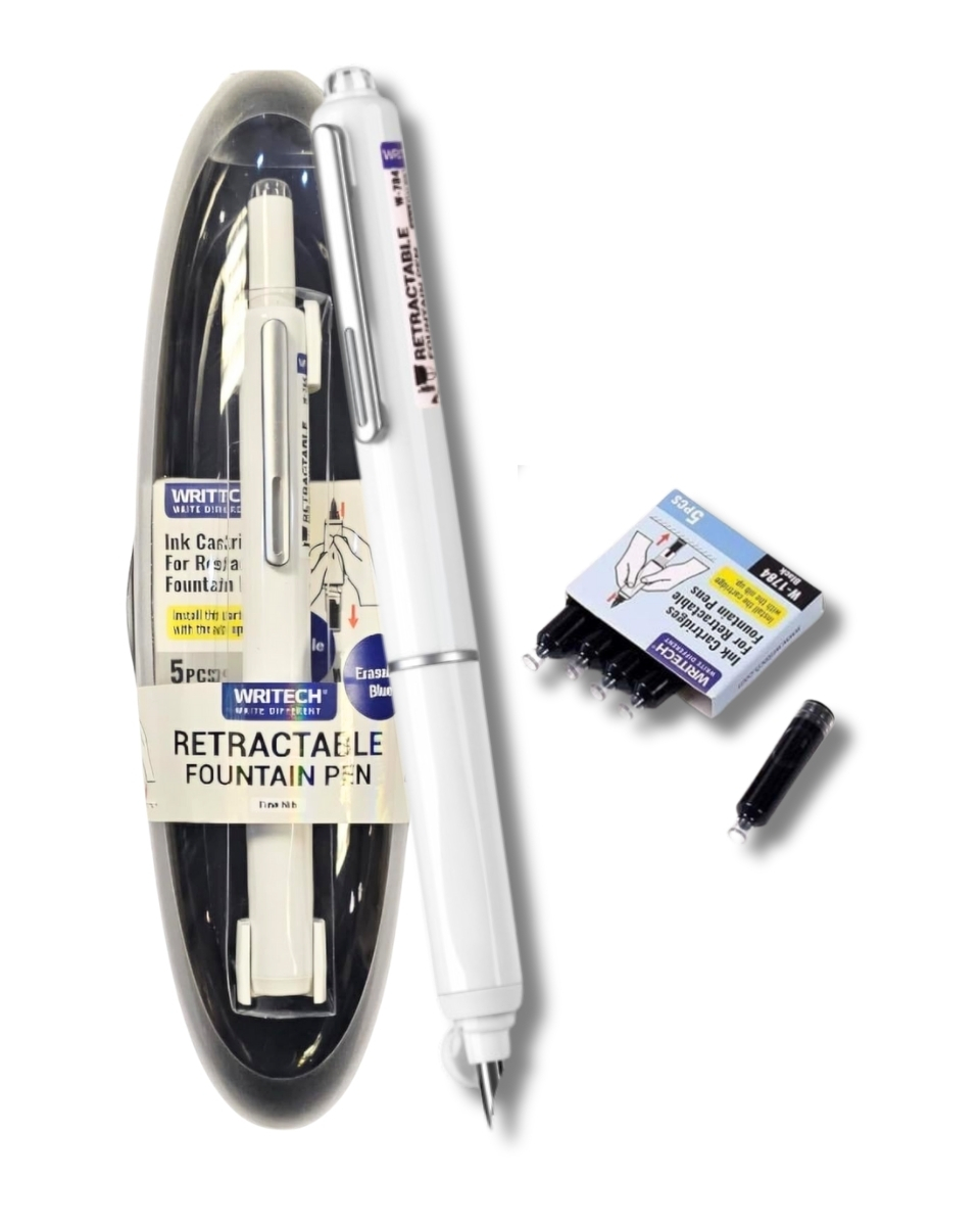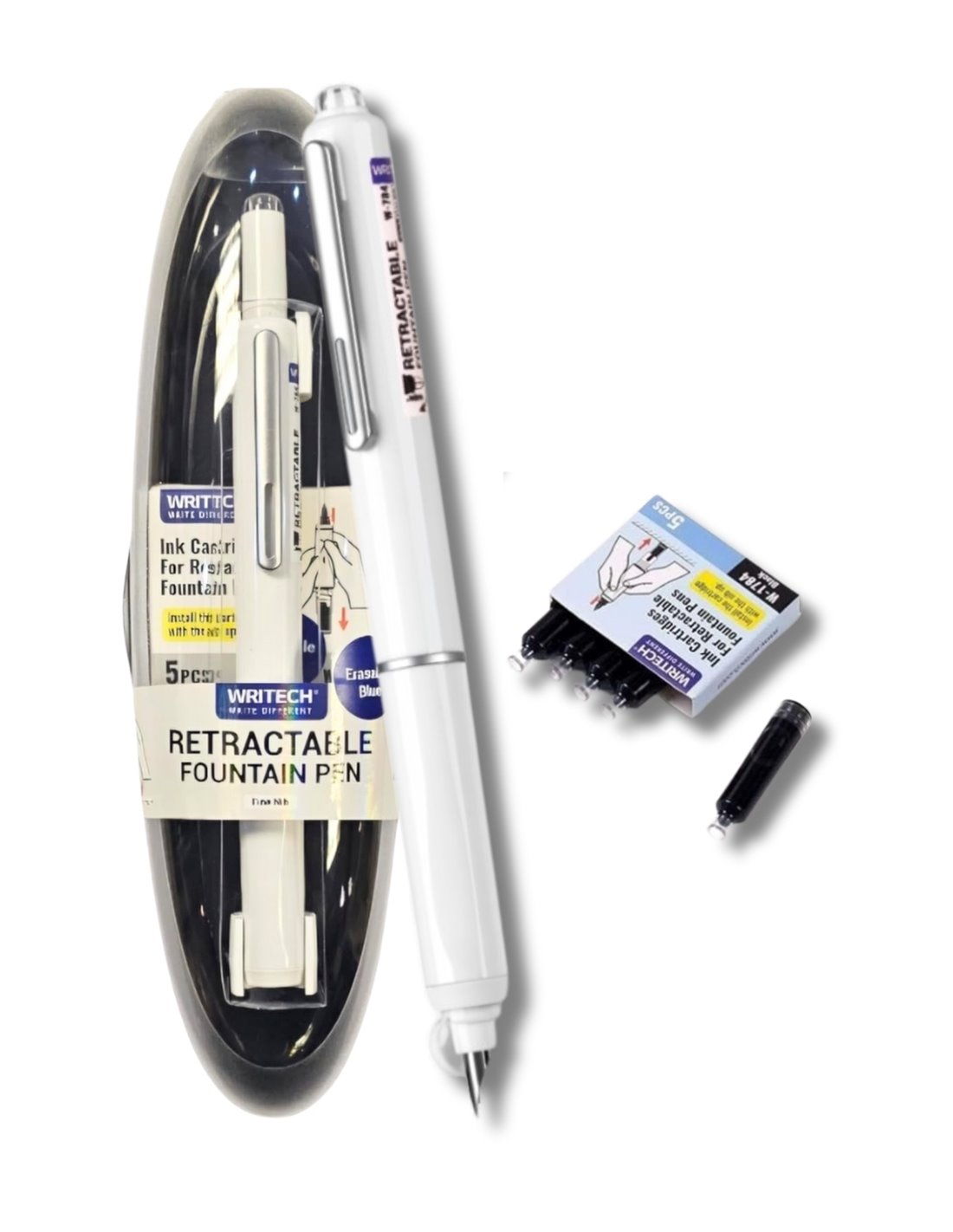 Corpul negru, cu design sobru și elegant, este completat de o cutie rezistentă din plastic, ceea ce transformă acest stilou într-un cadou potrivit pentru orice vârstă. Setul include 5 cartușe cu cerneală albastru cristal, iar compatibilitatea este exclusivă cu cartușele de cerneală Writech, pentru o experiență optimă de scriere.