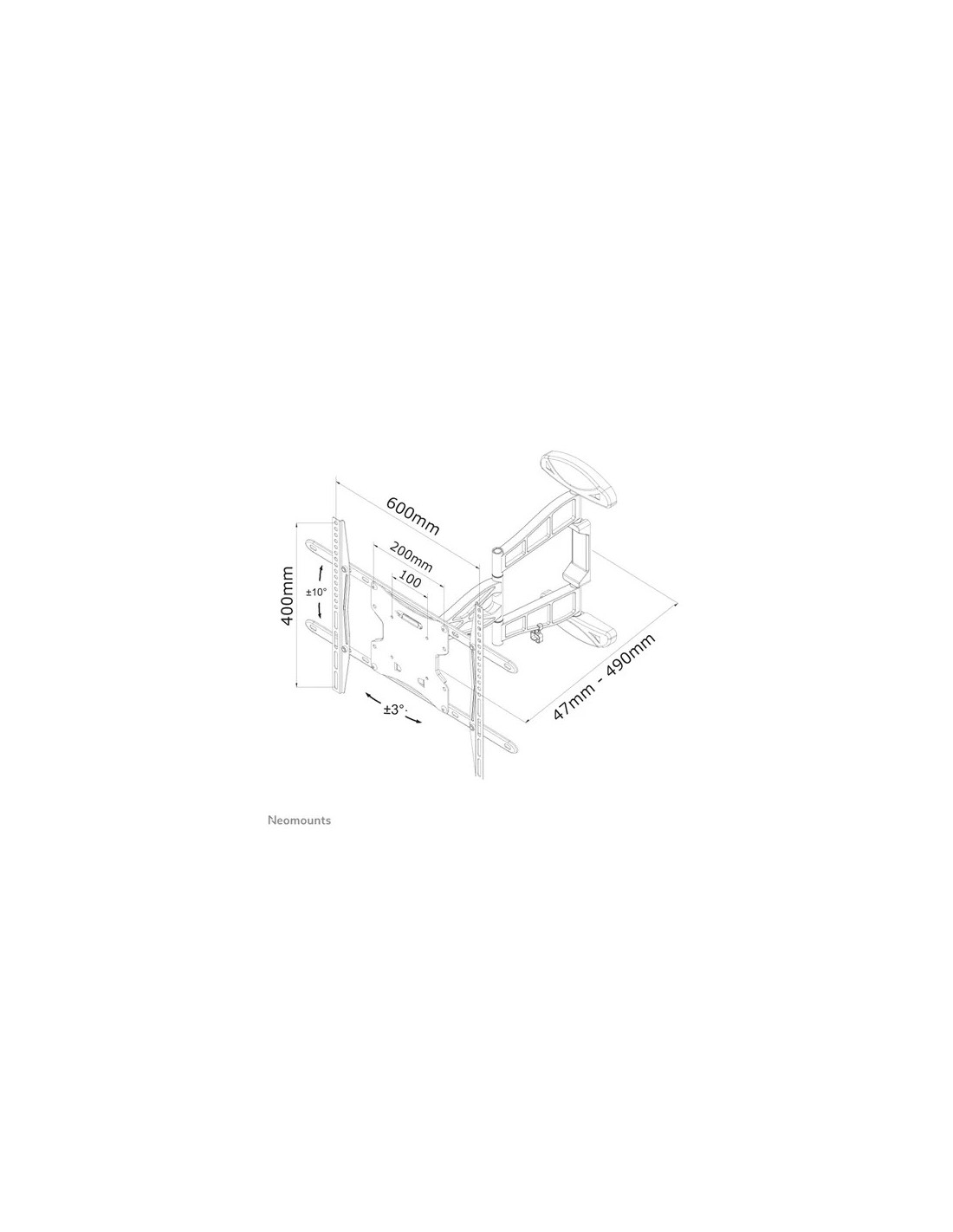 Neomounts by Newstar LED-W500 TV/Monitor Wall Mount (Full Motion) for 32"-60" Screen - Black Specifications General Min. screen size*: 32 inch Max. screen size*: 60 inch Min. weight: 0 kg Max. weight: 30 kg Screens: 1 VESA pattern: 100x100, 100x200, 200x100, 200x200, 200x300, 200x400, 300x100, 300x200, 300x300, 400x200, 400x300, 400x400, 400x600, 440x400, 500x400, 600x200, 600x300, 600x400 mm VESA minimum: 100x100 mm VESA maximum: 600x400 mm Distance to wall: 4,7 - 49 cm Functionality Type: Full motion, Tilt, Rotate, Swivel Tilt (degrees): 10° Swivel (degrees): 180° Rotate (degrees): 6° Height adjustment: None https://www.neomounts.com/tv-lfd/wall-mounts/led-w500-neomounts-by- newstar-tv-wall-mount/