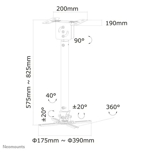 weight: 15 kg Functionality Type: Full motion, Tilt, Rotate, Swivel Tilt (degrees): 40° Swivel (degrees): 40° Rotate (degrees): 360° Height: 58 - 83 cm Height adjustment: Manual https://www.neomounts.com/projector/ceiling-mounts/beamer-c100silver- neomounts-by-newstar-projector-ceiling-mount/