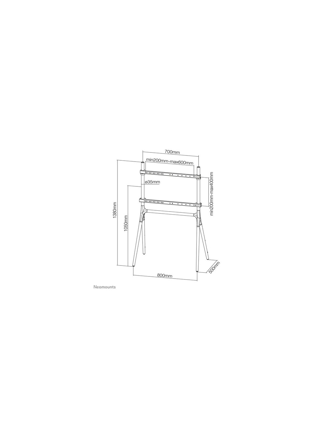 weight: 40 kg Screens: 1 VESA pattern: 200x200, 200x300, 200x400, 300x200, 300x300, 400x200, 400x300, 400x400, 400x600, 600x200, 600x300, 600x400 mm VESA minimum: 200x200 mm VESA maximum: 600x400 mm Functionality Width: 80 cm Depth: 50 cm Height: 138 cm Height adjustment: Manual https://www.neomounts.com/tv-lfd/floor-stands/nm-m1000black-neomounts- by-newstar-select-floor-stand/