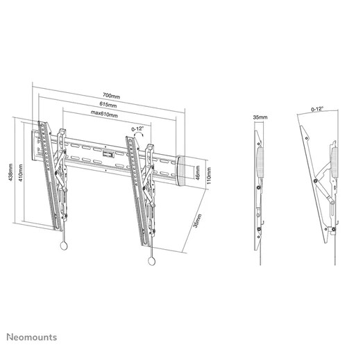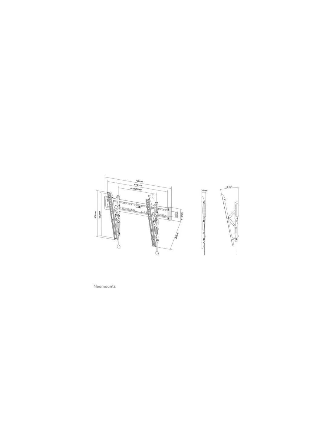 weight: 35 kg Screens: 1 VESA pattern: 100x100, 100x200, 200x100, 200x200, 200x300, 200x400, 300x100, 300x200, 300x300, 350x350, 400x200, 400x300, 400x400, 440x400, 500x400, 600x200, 600x300, 600x400 mm VESA minimum: 100x100 mm VESA maximum: 600x400 mm Distance to wall: 3,5 cm Functionality Type: Tilt Tilt (degrees): 12° Height adjustment: None https://www.neomounts.com/tv-lfd/wall-mounts/nm-w365black-neomounts-by- newstar-select-tv-wall-mount/