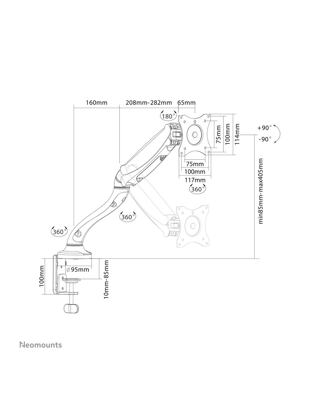 Neomounts NM-D500. Montaj: Clemă/înșurubare completă, Greutate maximă capacitate: 6 kilograme, Mărime minimă ecran: 25,4 cm (10"), Mărime maximă ecran: 76,2 cm (30"), Distanță minimă montare VESA: 75 x 75 milimetri, Distanță maximă montare VESA: 100 x 100 milimetri. Ajustare a înălţimii, Unghi de înclinare: 0 - 180°. Culoarea produsului: Negru