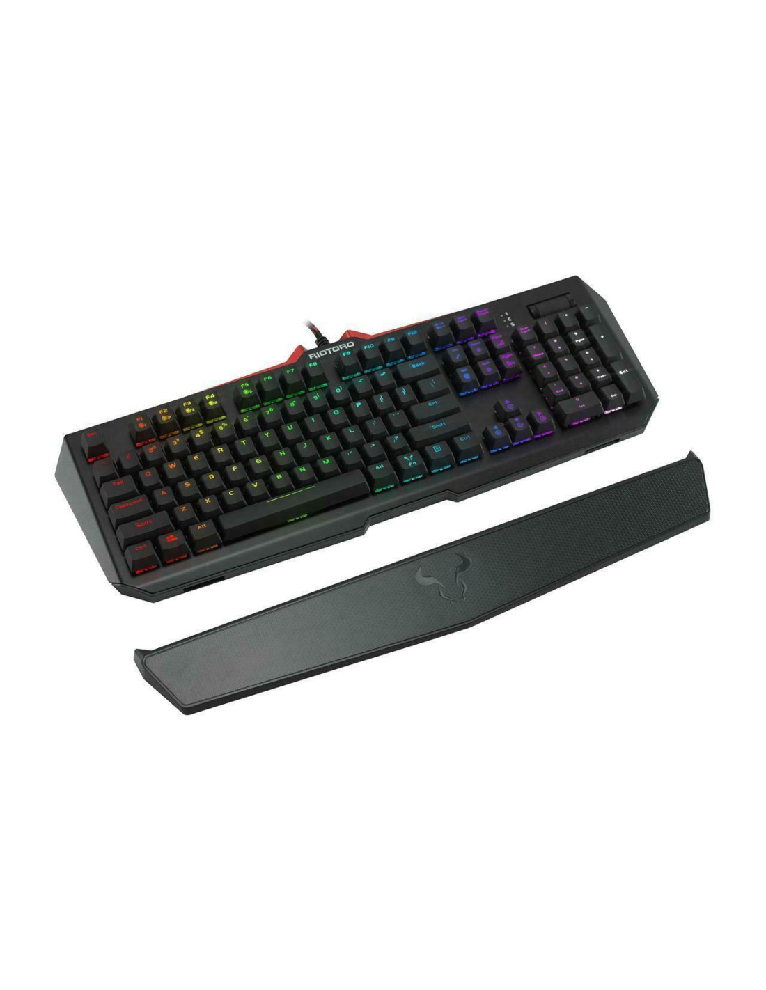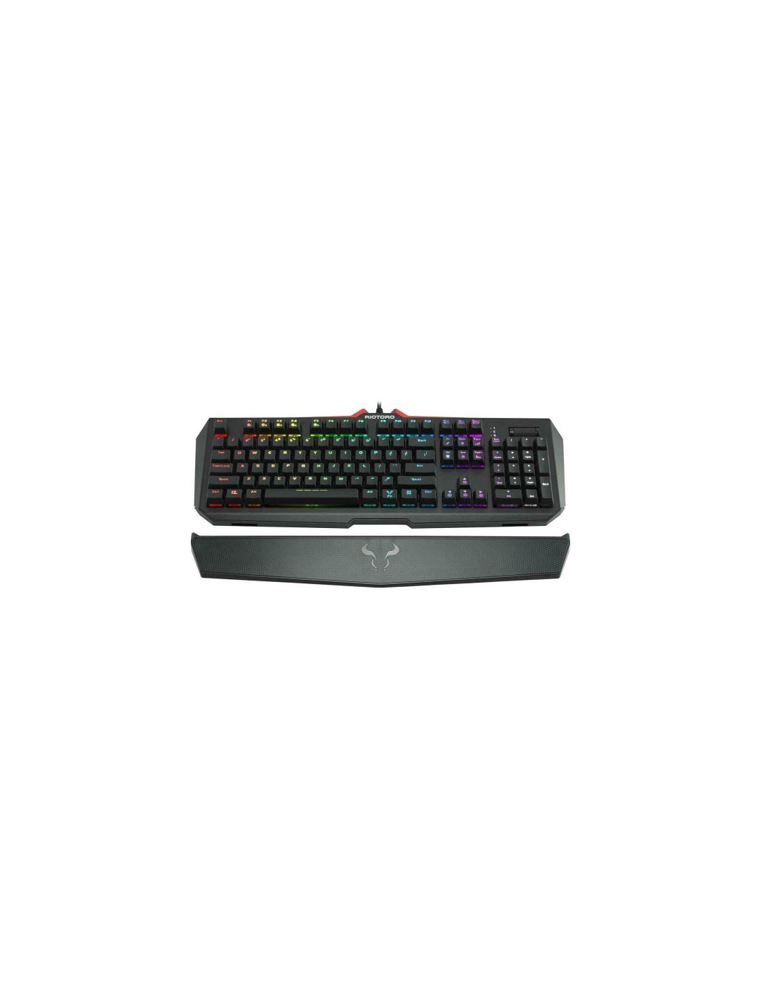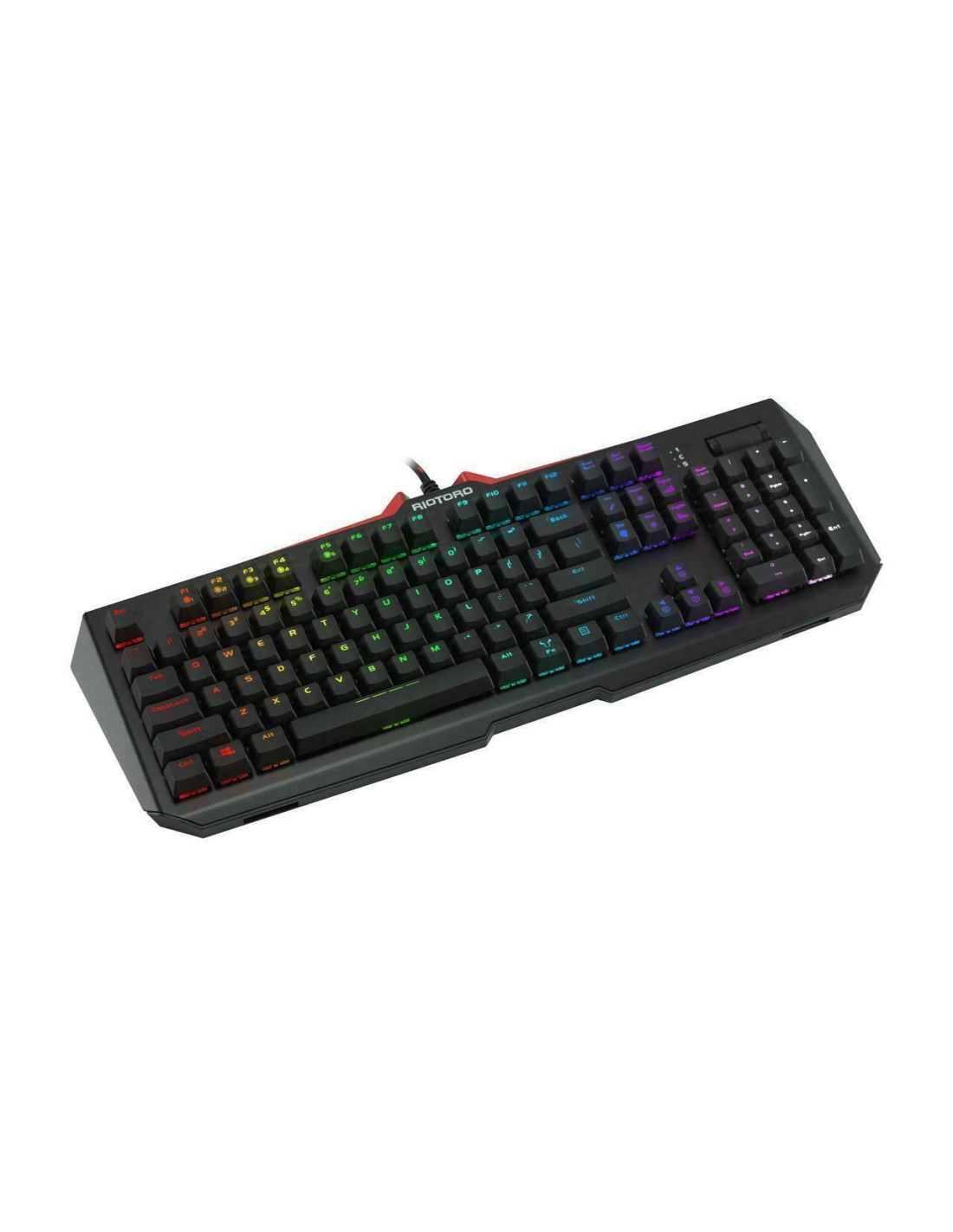 Tastatura gaming mecanica Riotoro Ghostwriter Elite Cherry MX Silent Red neagra iluminare RGB, switch-uri Cherry MX Silent Red, sasiu de aluminiu, toate tastele fara conflict (n-key rollover), iluminare LED RGB a tastelor(10 jocuri de iluminare, diferite nivele de intensitate), 6 taste multimedia, palmrest detasabil, software ce permite diferite configurari, HUB USB integrat cu 1 port, conector 2x USB, dimensiuni: 482.6x165.1x50.1mm, greutate: 1.2kg