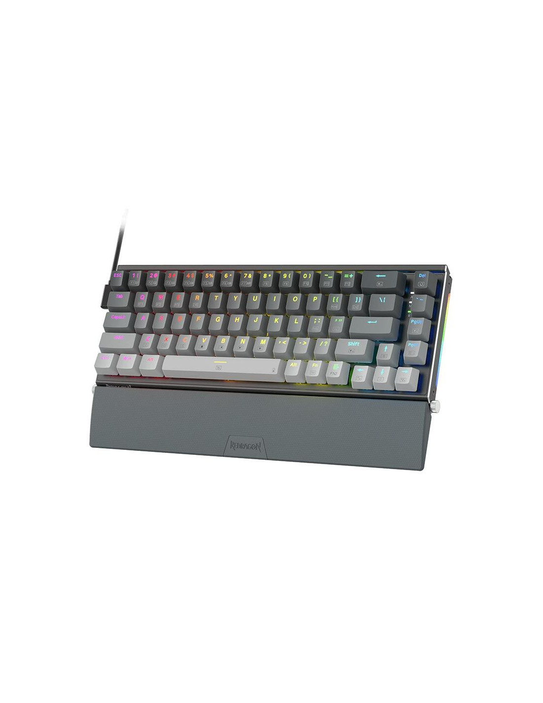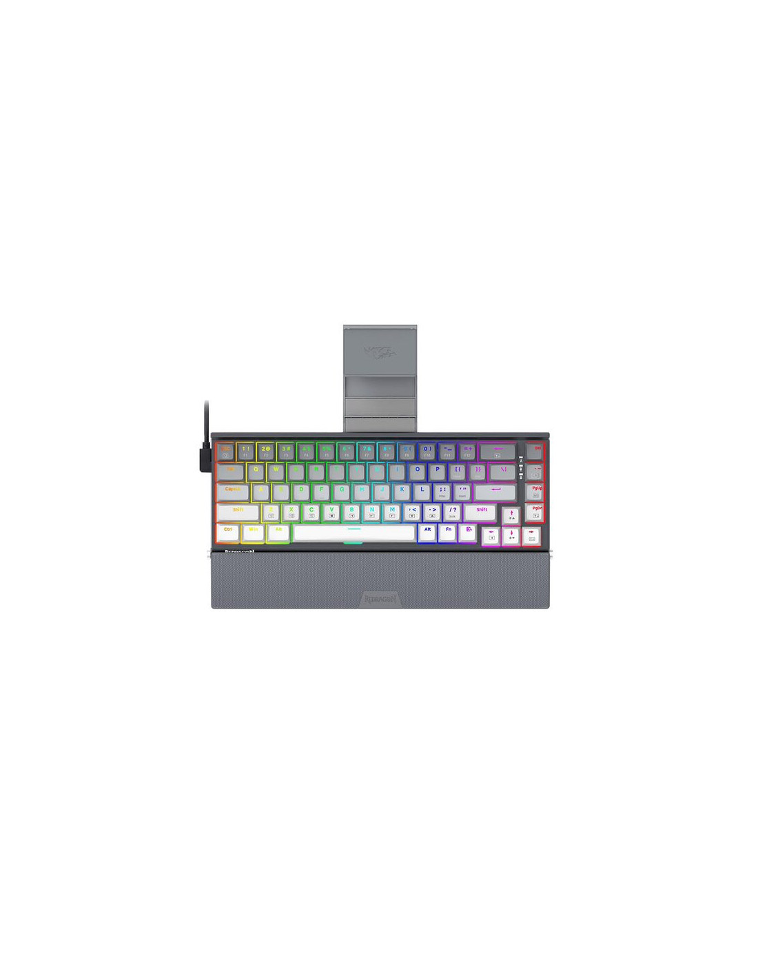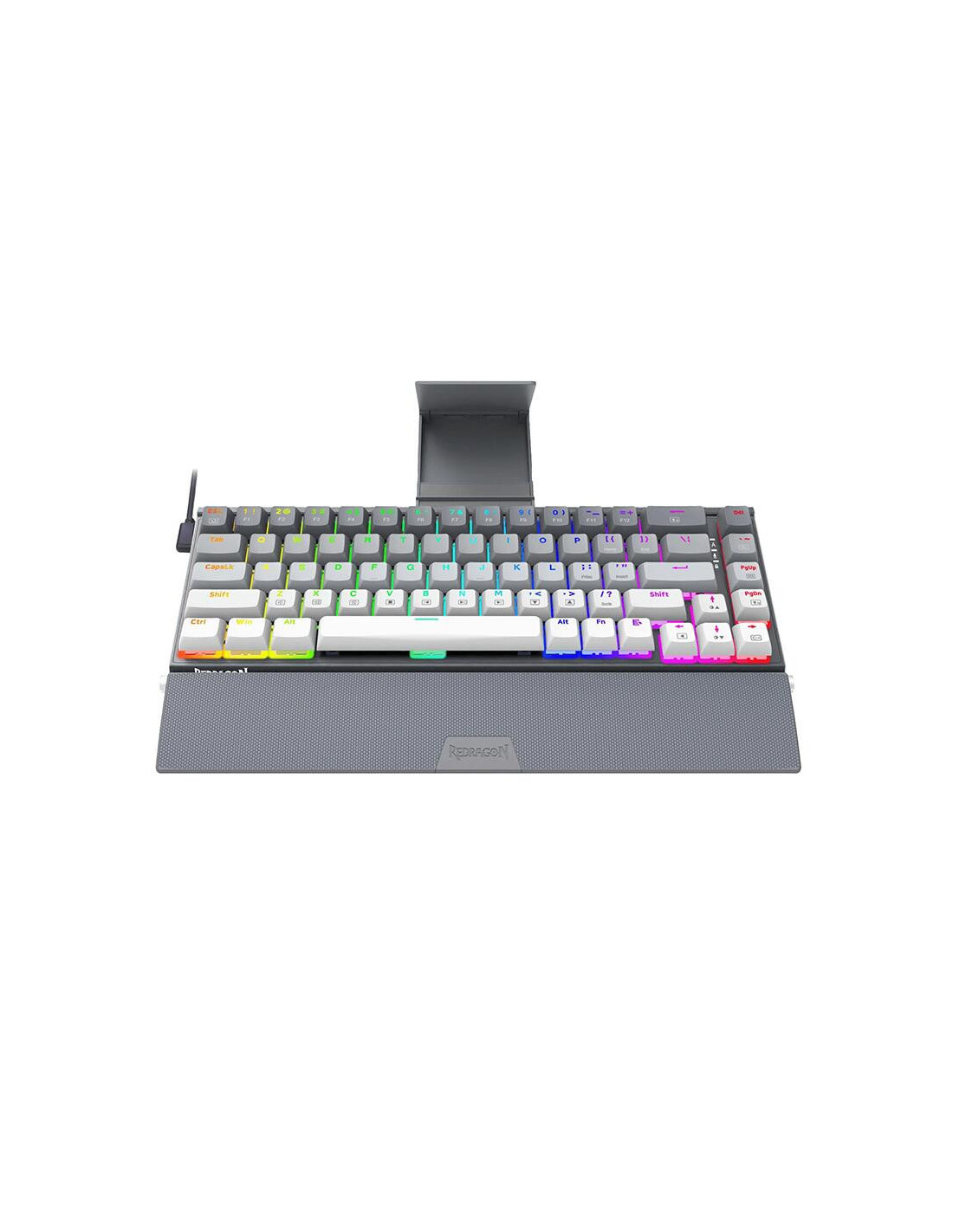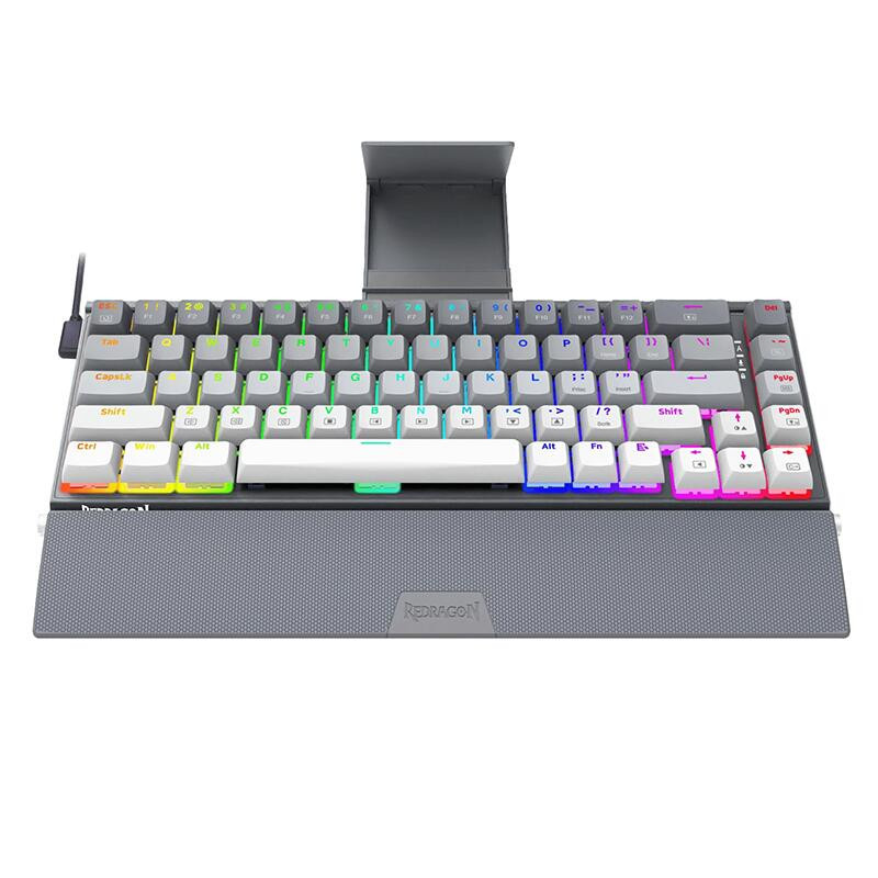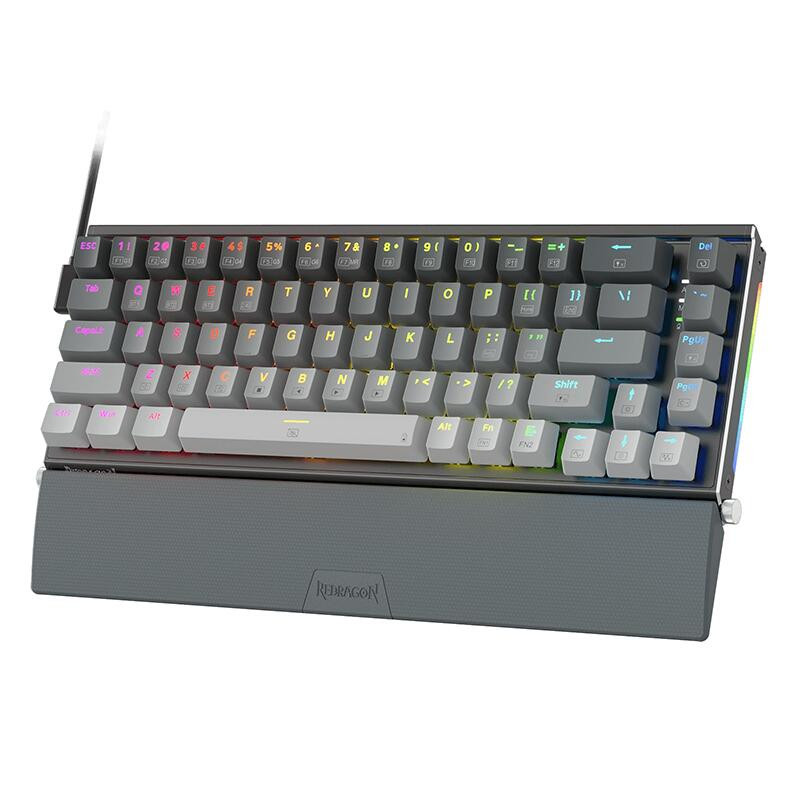Tastatura gaming mecanica Bluetooth cu si fara fir Redragon Shaco PRO gri iluminare RGB, sasiu din aluminiu, switch-uri Redragon rosii, toate tastele fara conflict - 68 taste (n-key rollover), protocol bluetooth: 5.0, se pot conecta 3 device-uri simultan (se selecteaza device-ul pe care il folositi din combinatia de taste FN si Q, W,si E), baterie: 1600mAh, protocol wireless 2.4 Ghz. iluminare LED RGB a tastelor (20 moduri de iluminare, reglarea intensitatii), EVA Silencer Foam instalata in interiorul tastaturii, tasta WIN poate fi dezactivata in timpul jocurilor, 6 taste MACRO, 7 taste multimedia, include switch-uri de schimb, palmrest detasabil, suport de telefon sau tableta detasabil, conector USB Type-C, cablu USB detasabil (cablu cu conectori USB Type-C si adaptor pentru USB Type A), dimensiuni: 320x167x37mm, greutate: 1105g