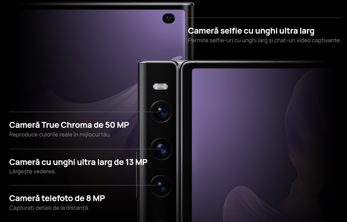 HUAWEI Mate Xs 2 vine in nuante uimitoare de violet, alb si negru, care completeaza un design 3D din fibra de sticla de vis, facandu-l o fuziune uluitoare de culoare, textura si tehnologie de ultima ora.