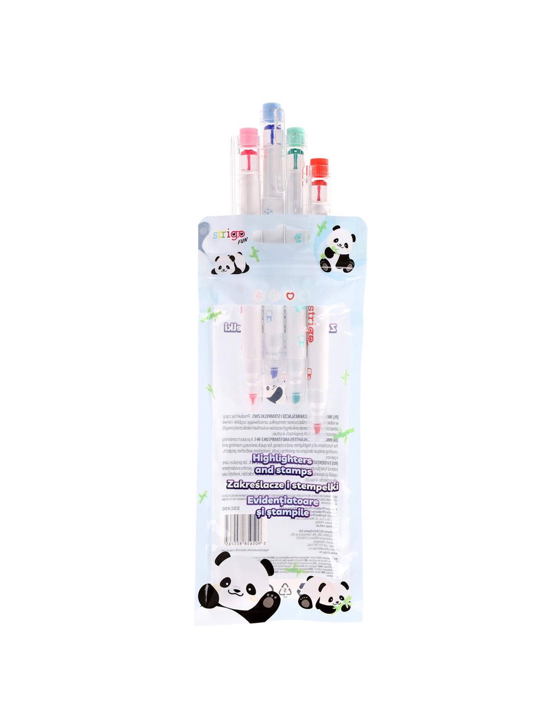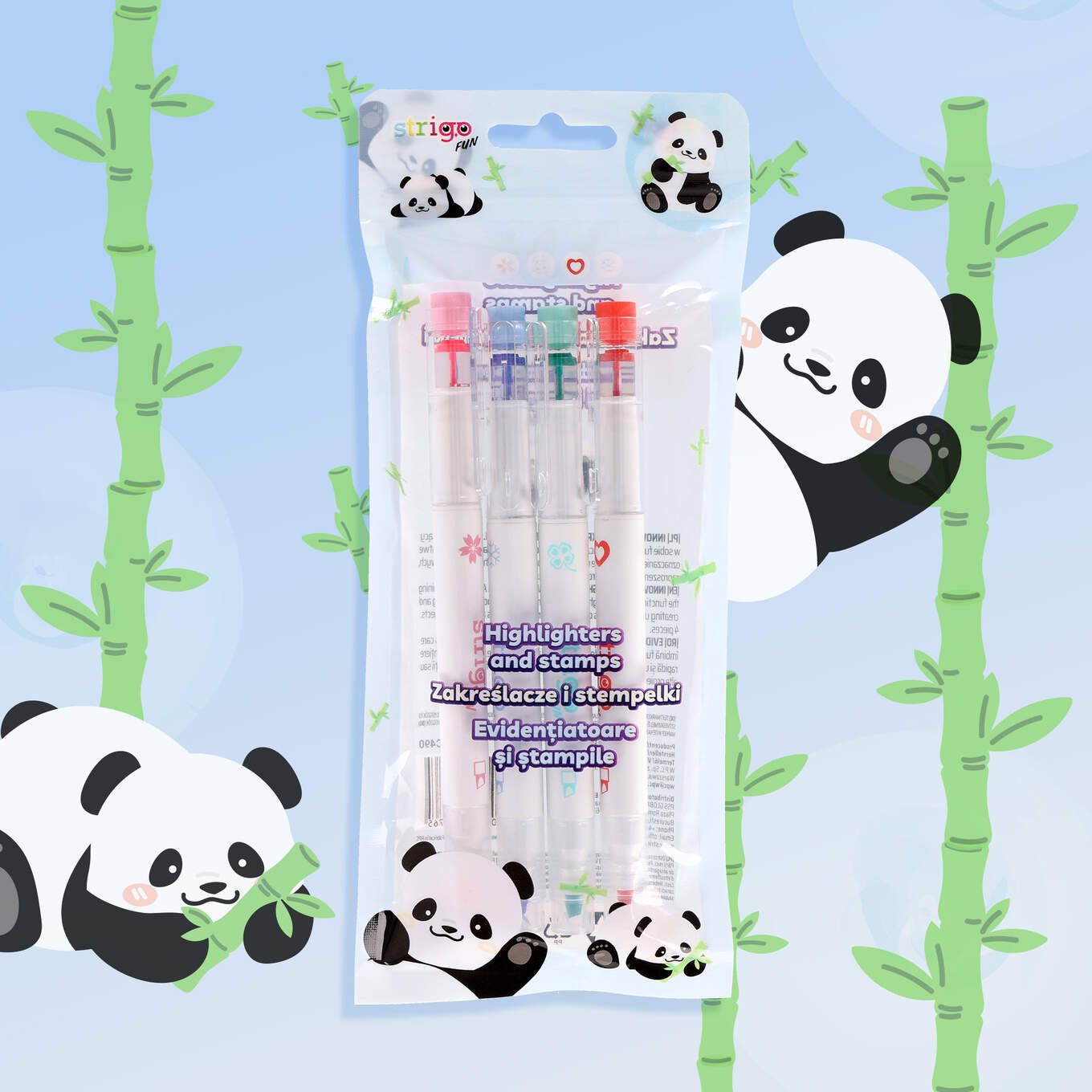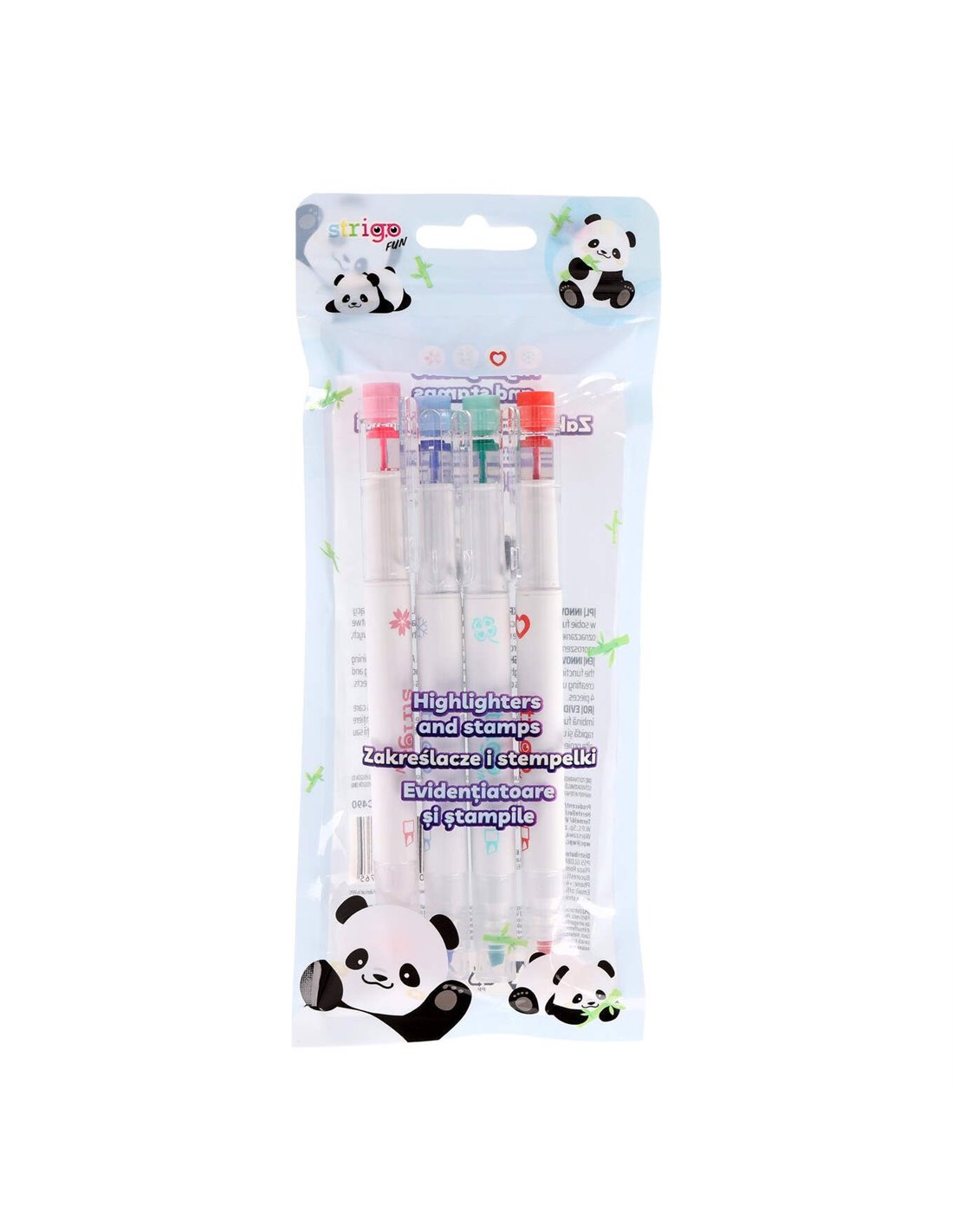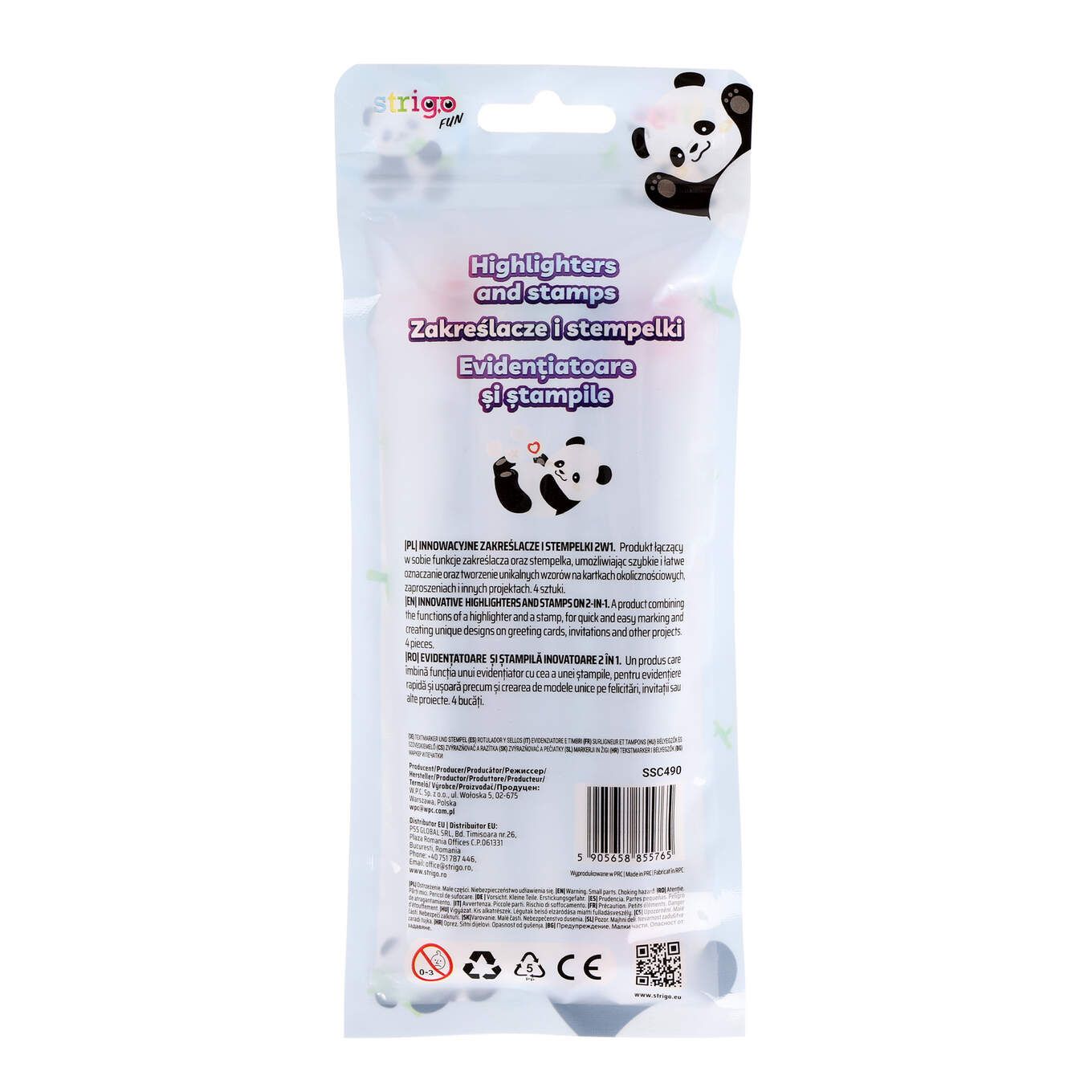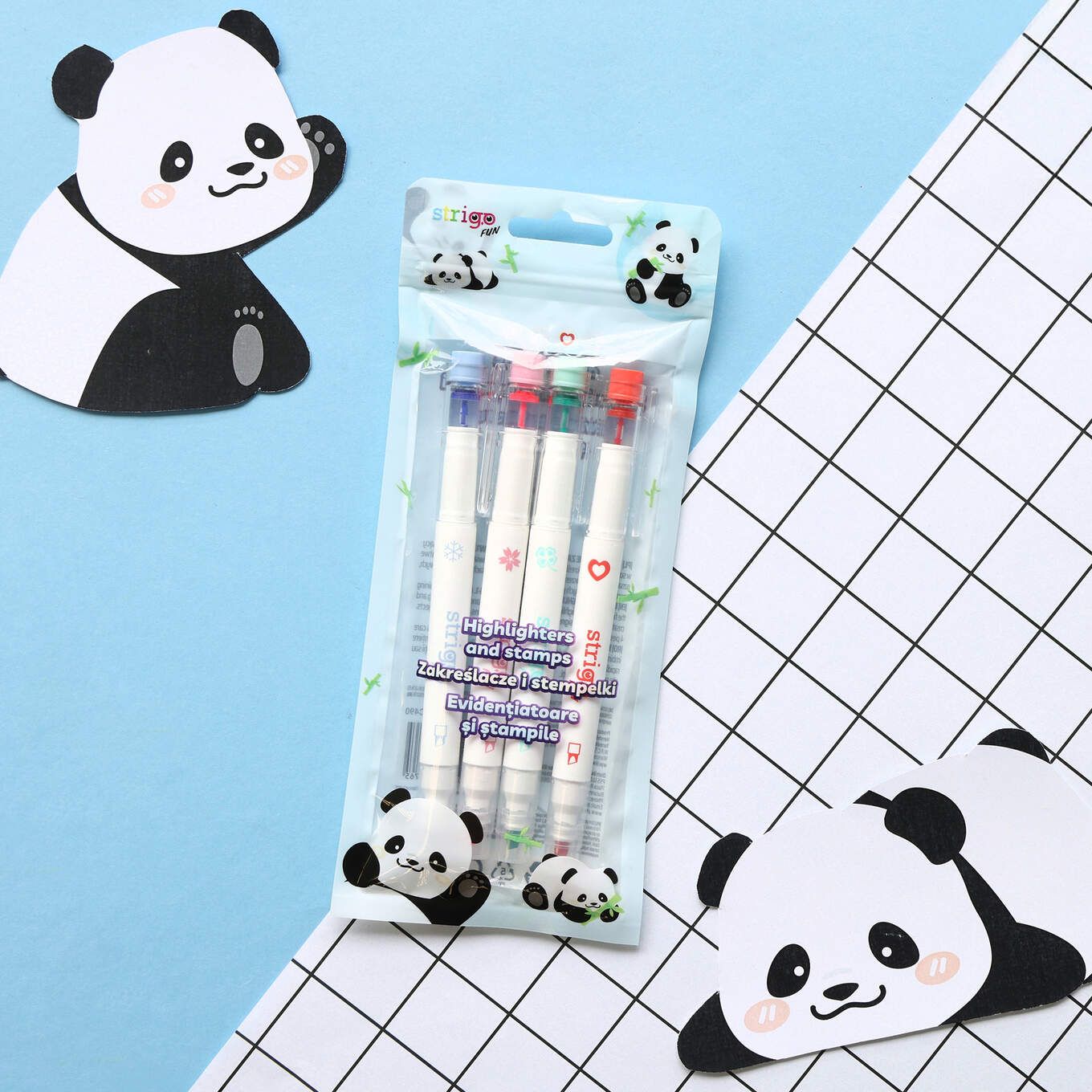 Setul de 4 evidențiatoare 2 în 1 cu ștampilă Strigo SSC490, motiv Panda, aduce culoare și distracție în orice activitate, fiind combinația perfectă între utilitate și creativitate.