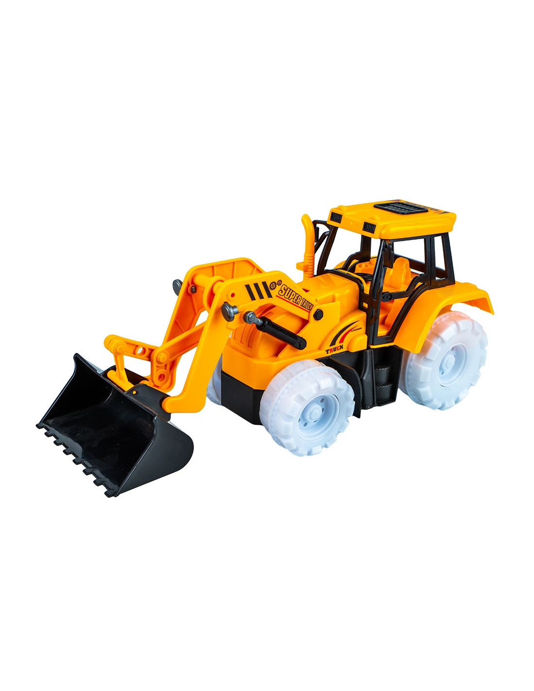 - Modelul este dotat cu brat articulat si cupa manevrate automat in timpul functionarii pentru a simula activitatile reale ale unui incarcator. Tractorul are efecte luminoase la nivelul rotilor frontale si cabinei, precum si efecte sonore atractive, care sporesc realismul jocului.