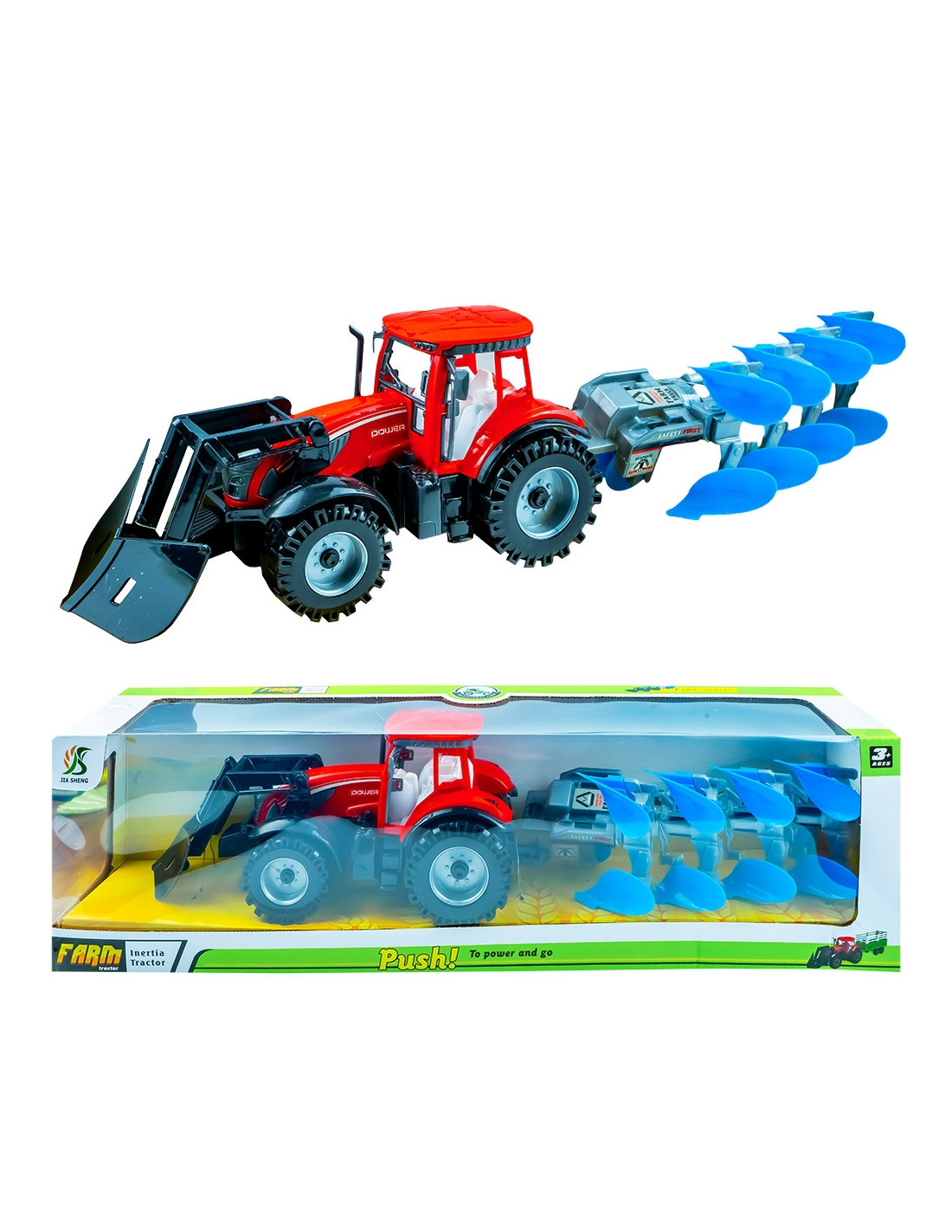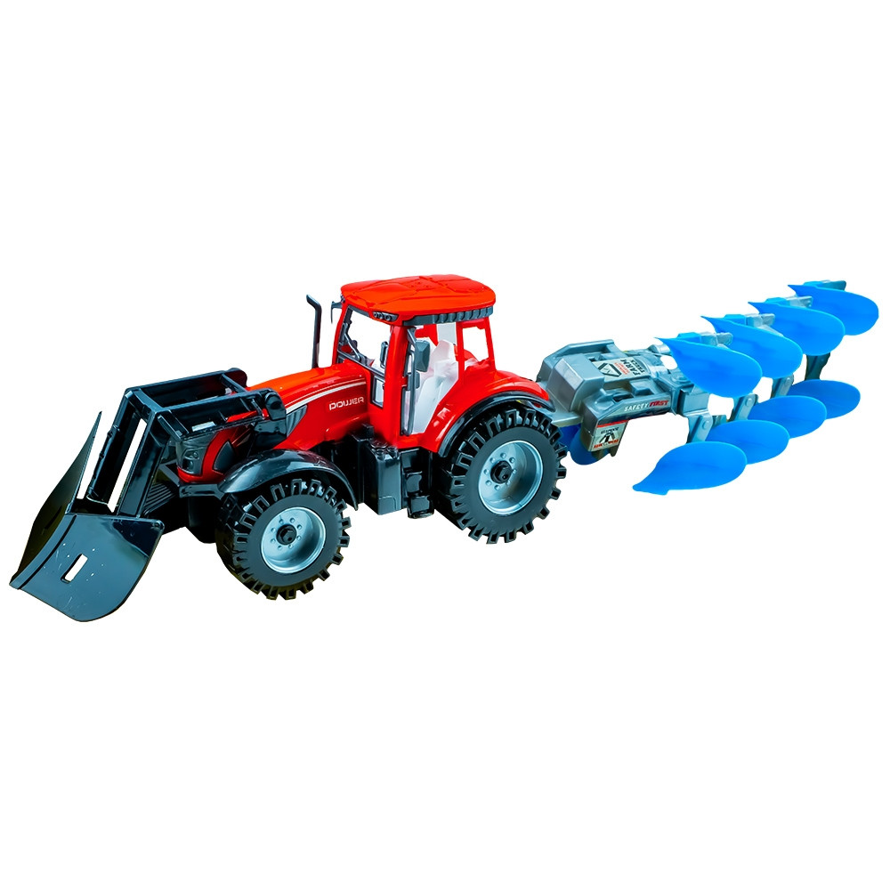 Dimensiuni jucarie (Lxlxh): tractor cu plug 52x10.7x12 cm, tractor 26.3x10.7x12 cm, plug 26.7x10.5x9.3 cm