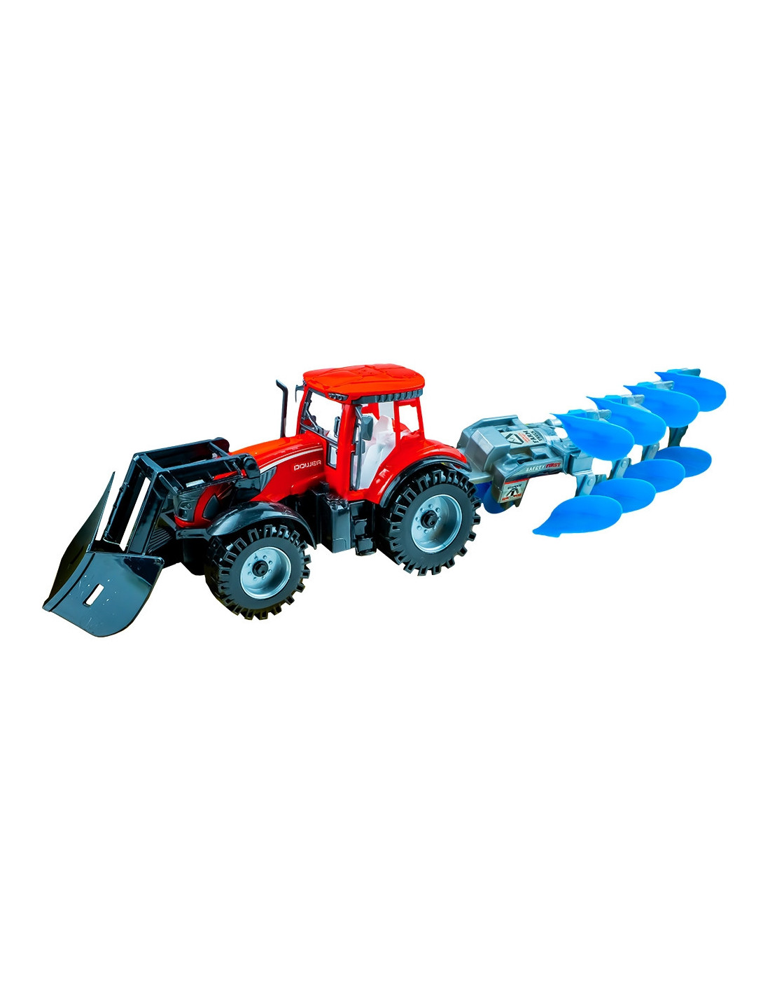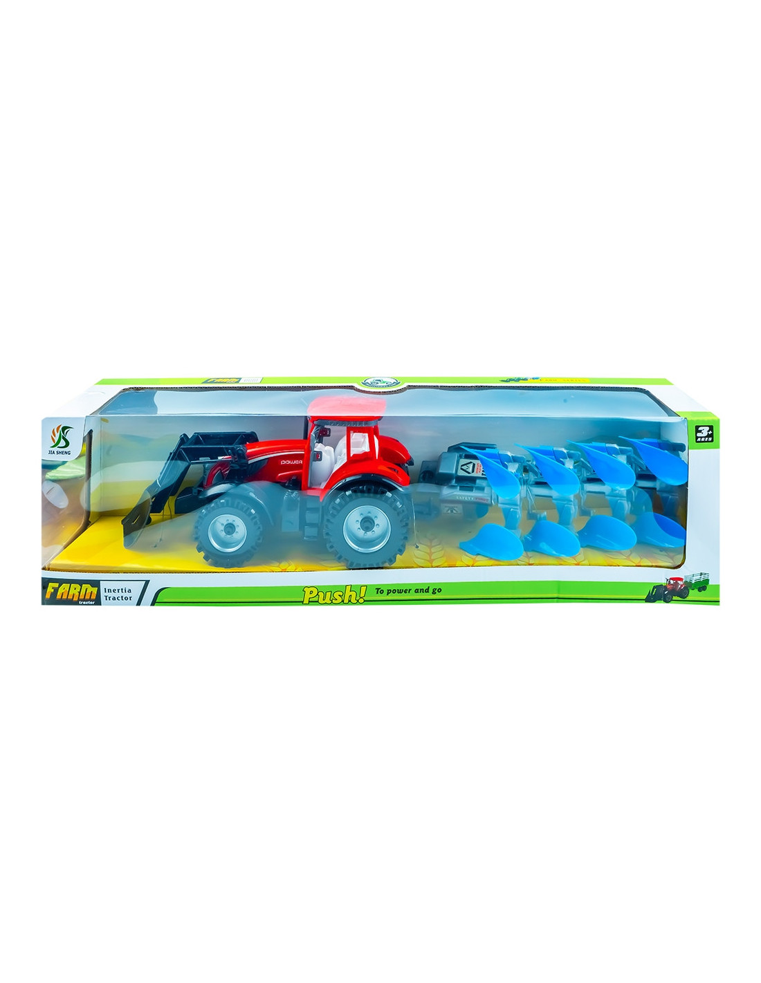 - Tractorul are forma ce imita realitatea, dar la o scara redusa. Acesta nu este un simplu tractor, ci este accesorizat cu o lama frontala a carei brat este articulat intr-un punct, pentru ca cei mici sa poata ridica sau cobori lama. Pentru deplasare vehiculul are inertie pe rotile din spate, tot ceea ce trebuie sa faca copilasii este sa impinga tractorul pentru ca acesta sa continue sa ruleze.