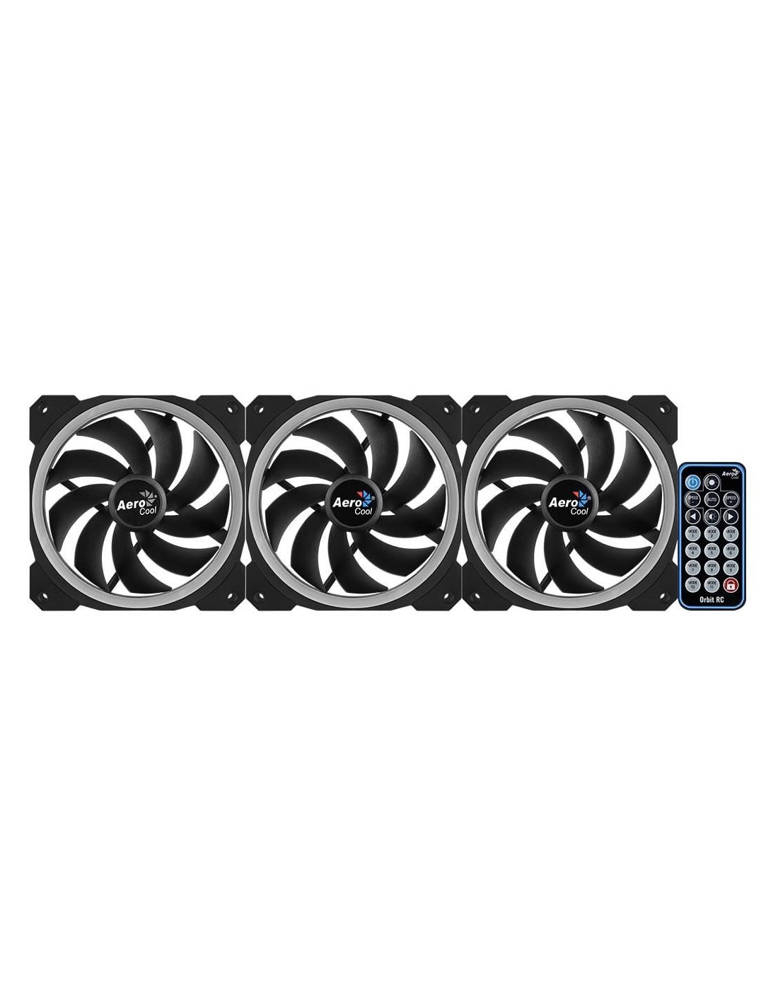 Set 3 ventilatoare Aerocool Orbit RC 120mm iluminare aRGB, iluminare LED aRGB dual-ring (20 LED-uri), rulmenti de tip Hydraulic Bearing, sistem de montare anti-vibratii, 1200 RPM, 55.9 CFM, 14.1 dBA, 1.15 mmH2O, cablu plat, dimensiuni: 120x120x25mm, conectori: VDG / adressable header / 6pin / 4pin, MTBF: 60000h, include HUB Orbit