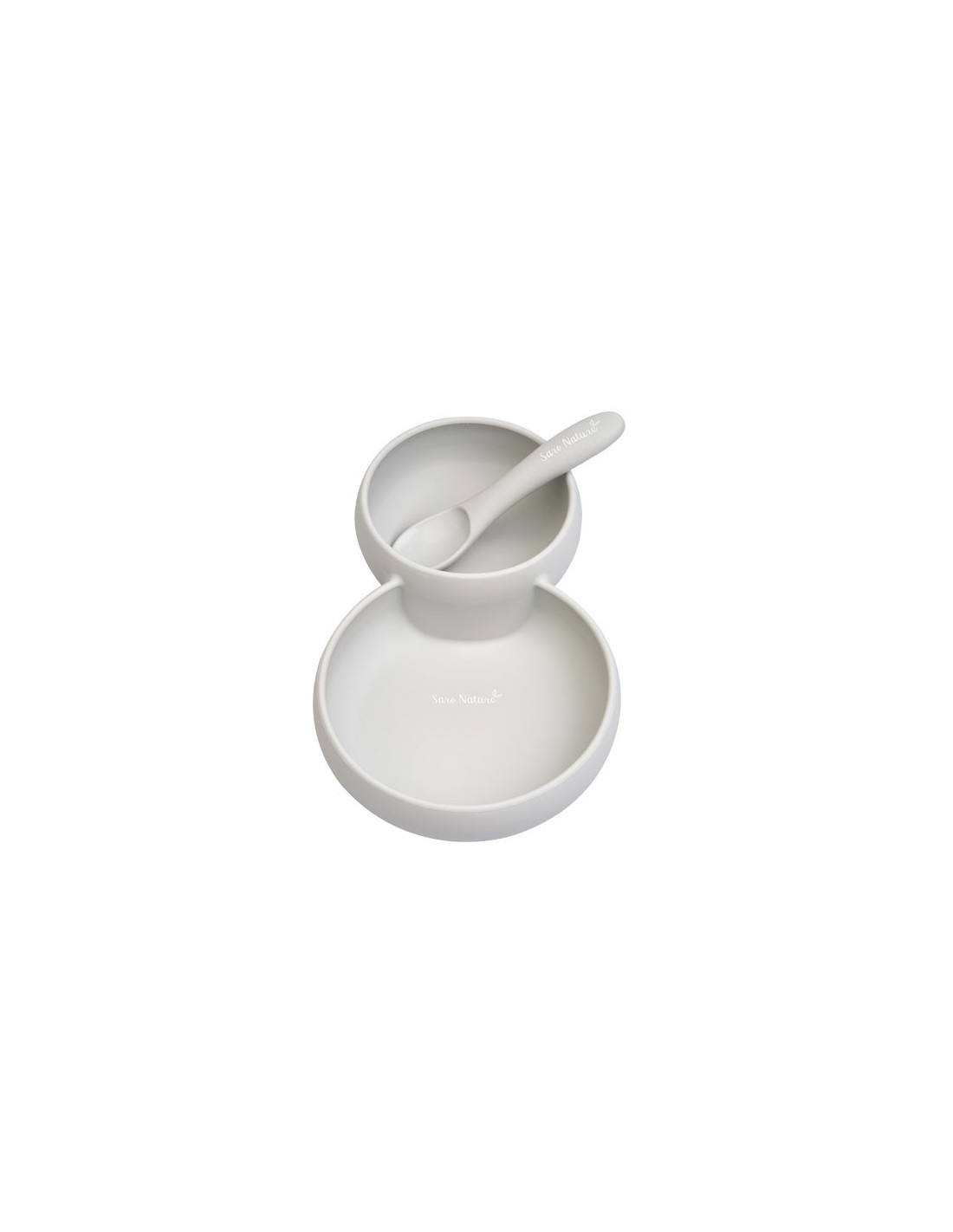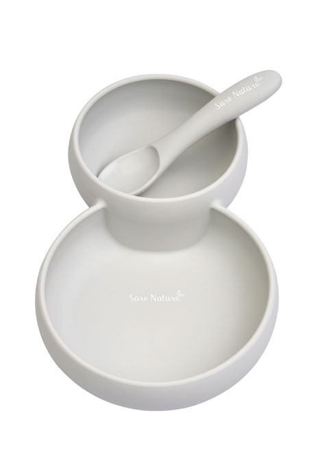 Set 2 in 1 Farfurie cu Bol si Lingurita din Silicon Twin Gri