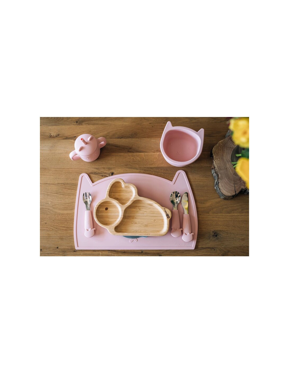 - Pentru ca copilul dumneavoastra sa invete sa se hraneasca singur, puteti combina farfuria din bambus FreeON cu urmatoarele articole FreeON: baza din silicon, tacamuri din inox , cana si bol din silicon. (Acestea se achizitioneaza separat de aici )
