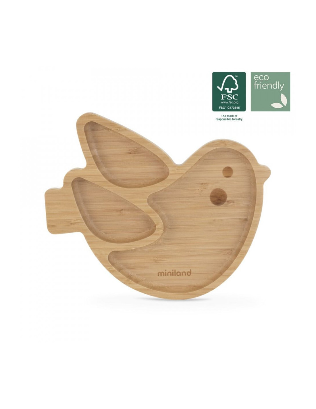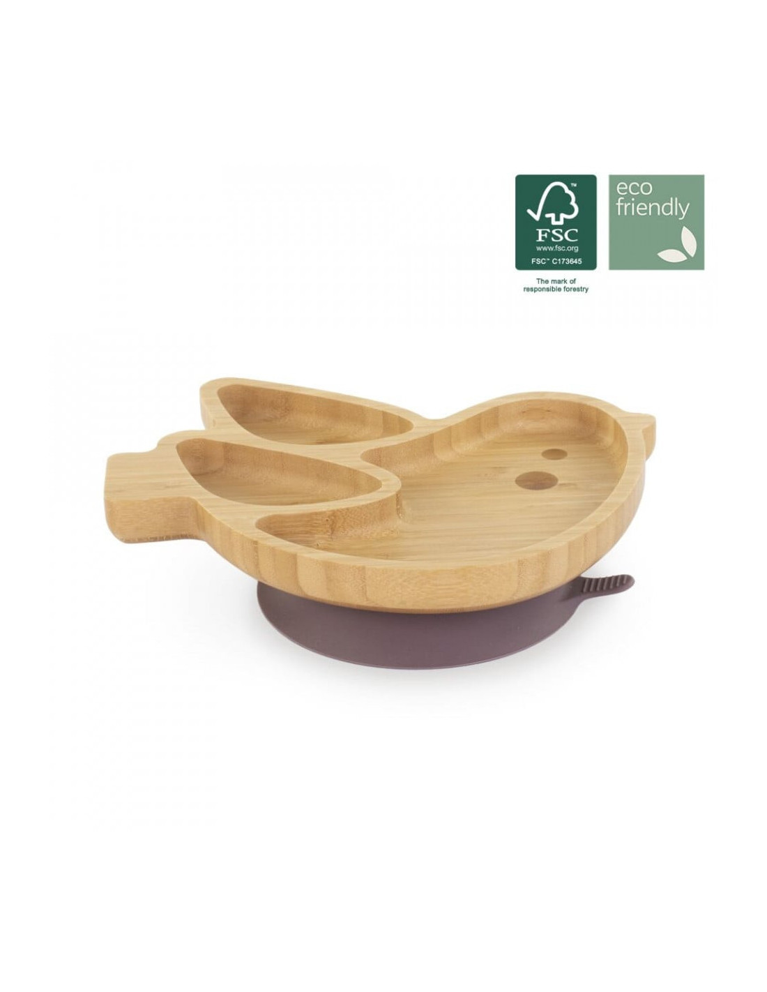 Farfuria este realizată 100% din lemn, iar ventuza din silicon alimentar.