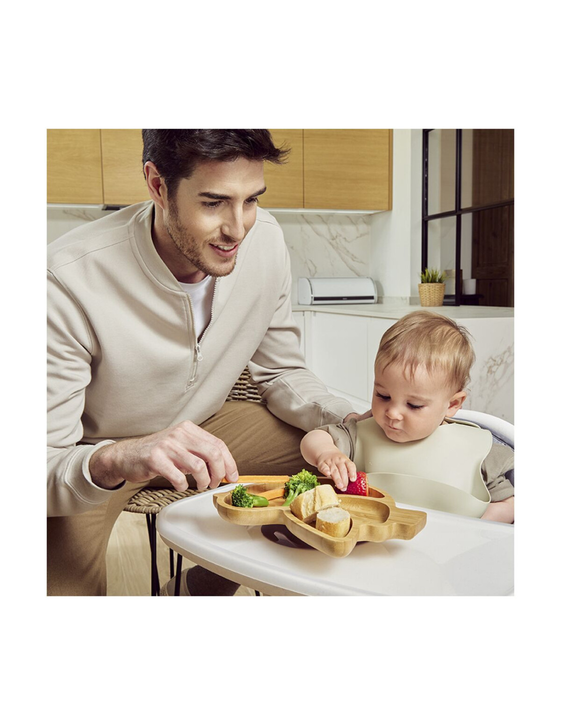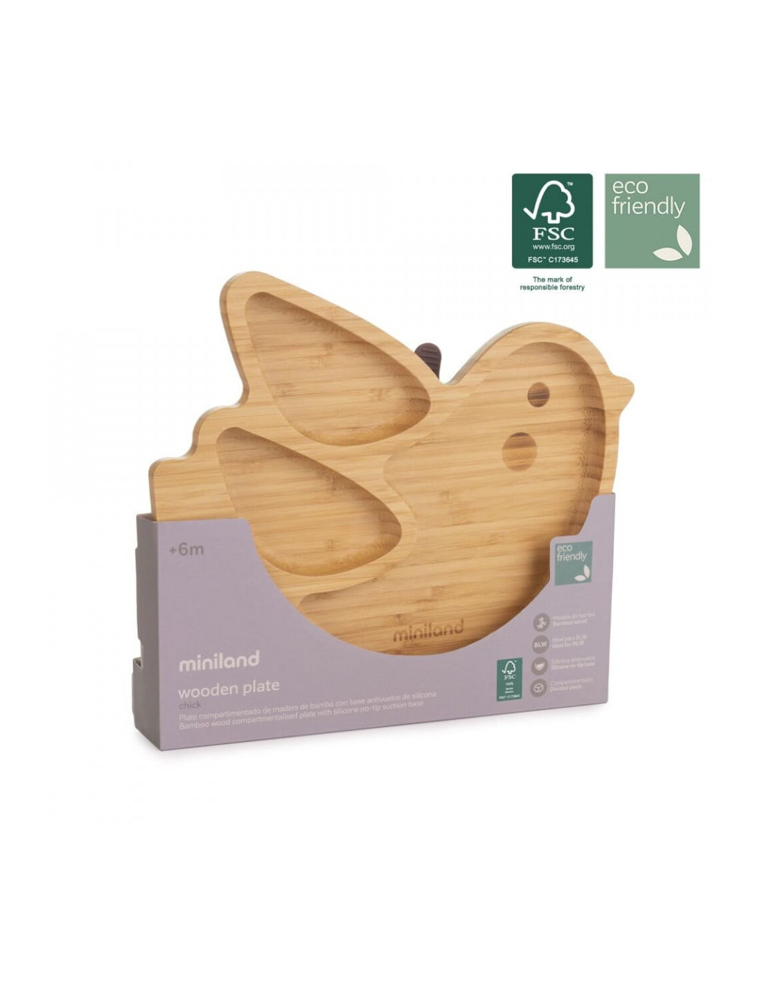 Setul include o farfurie din bambus, material natural, durabil, să înveți să faci diferența dintre alimente și să crești cu respect pentru mediul inconjurator.